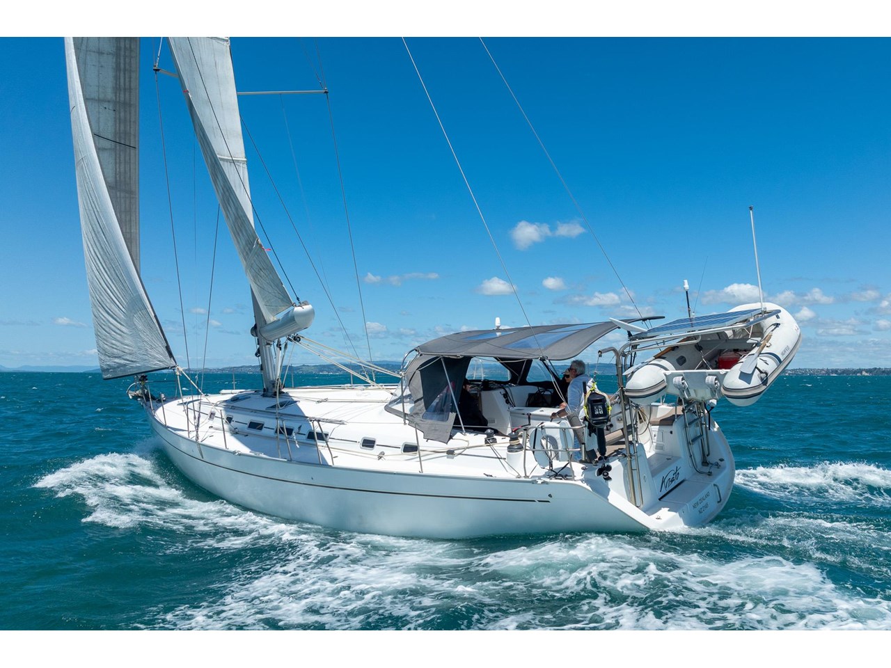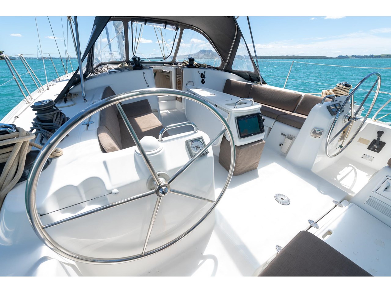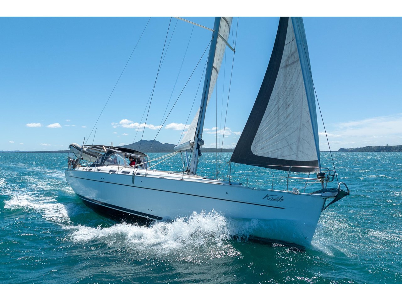 KRISTO is equipped for easy, efficient handling: the Leisure Furling mainsail, furling genoa, and all control lines led back to the cockpit make single- or double-handed sailing straightforward. The bow thruster provides precise manoeuvrability in tight harbours, while her deck layout allows all sail adjustments to be made safely and conveniently from the helm.