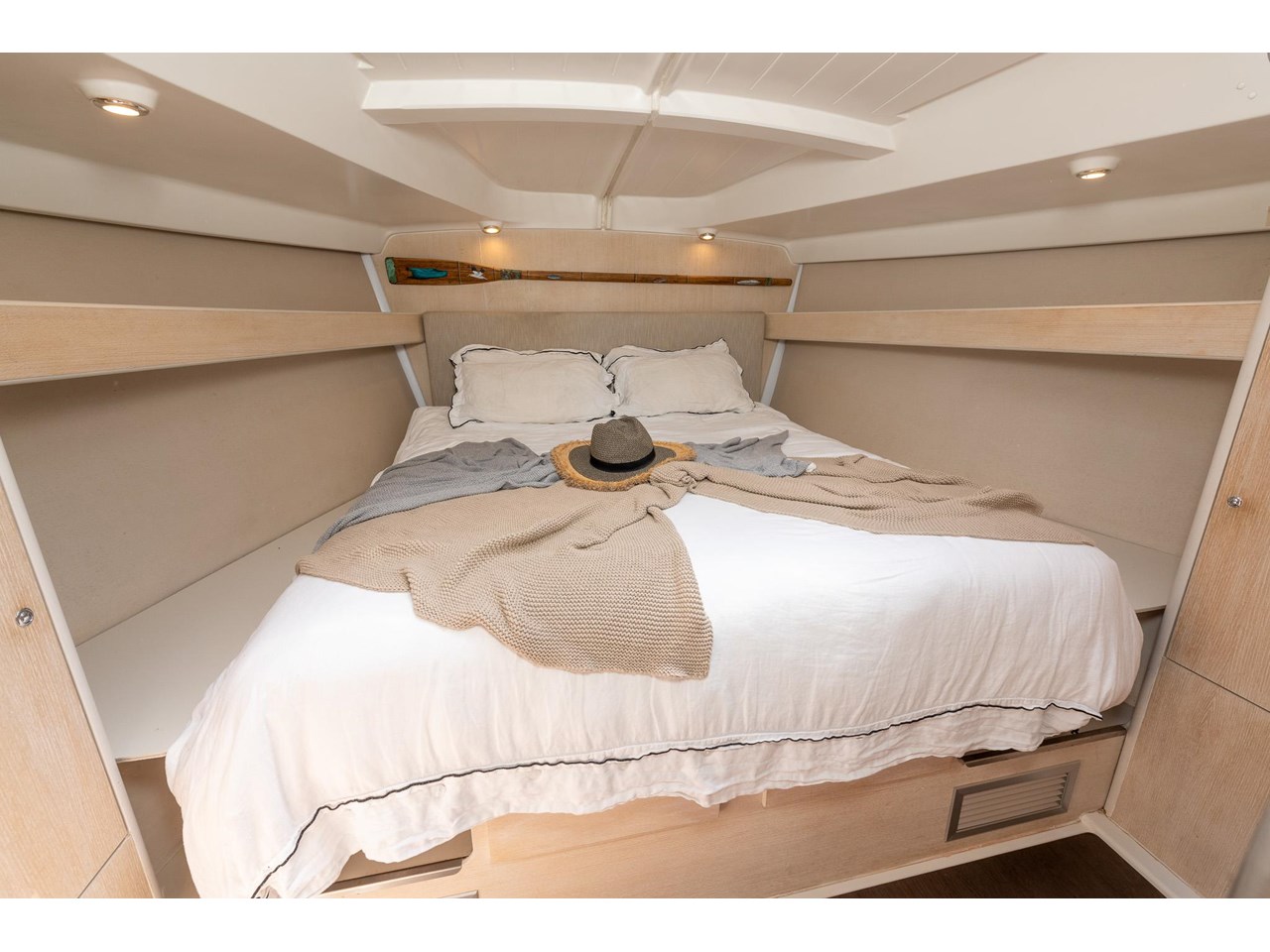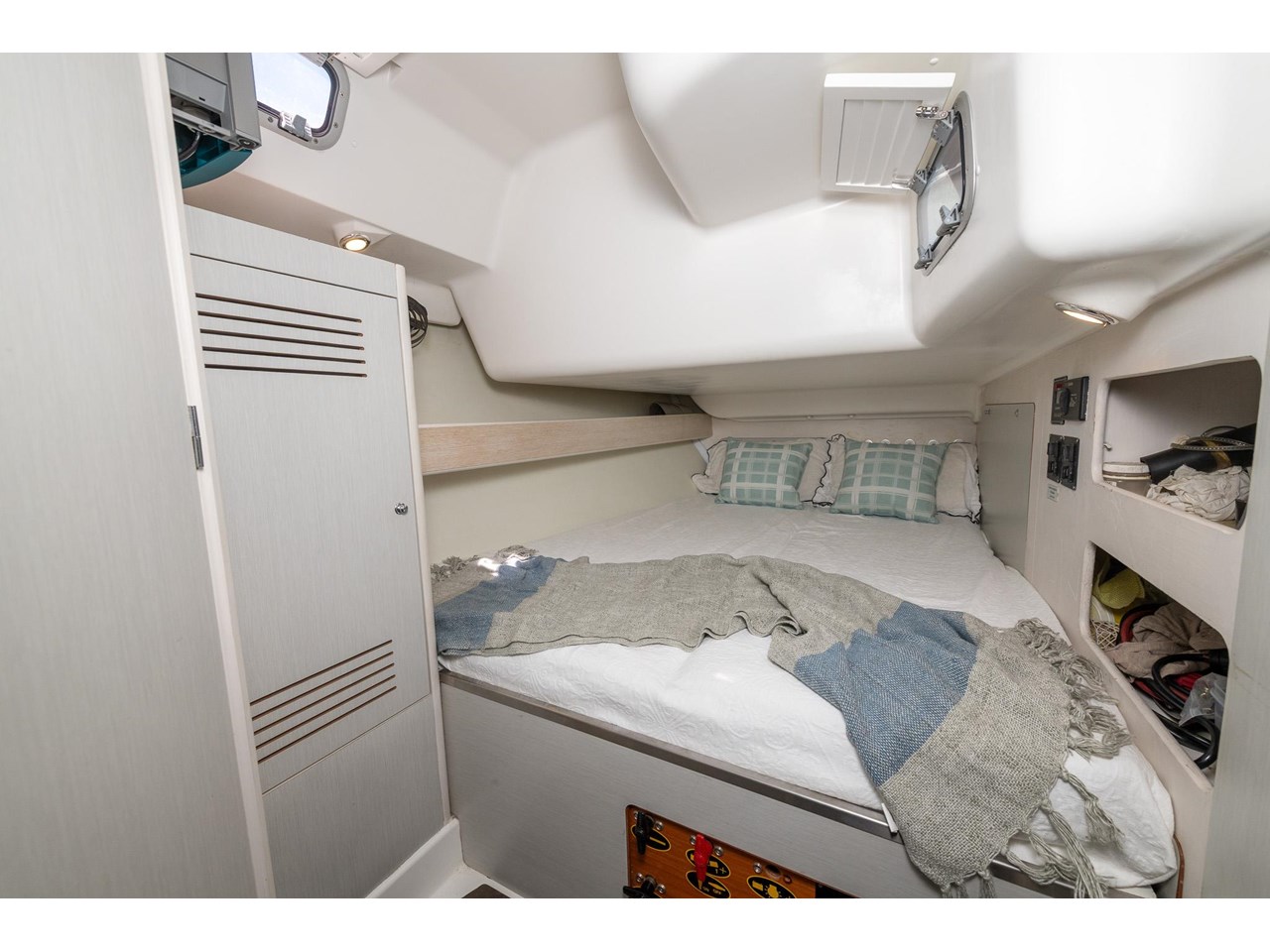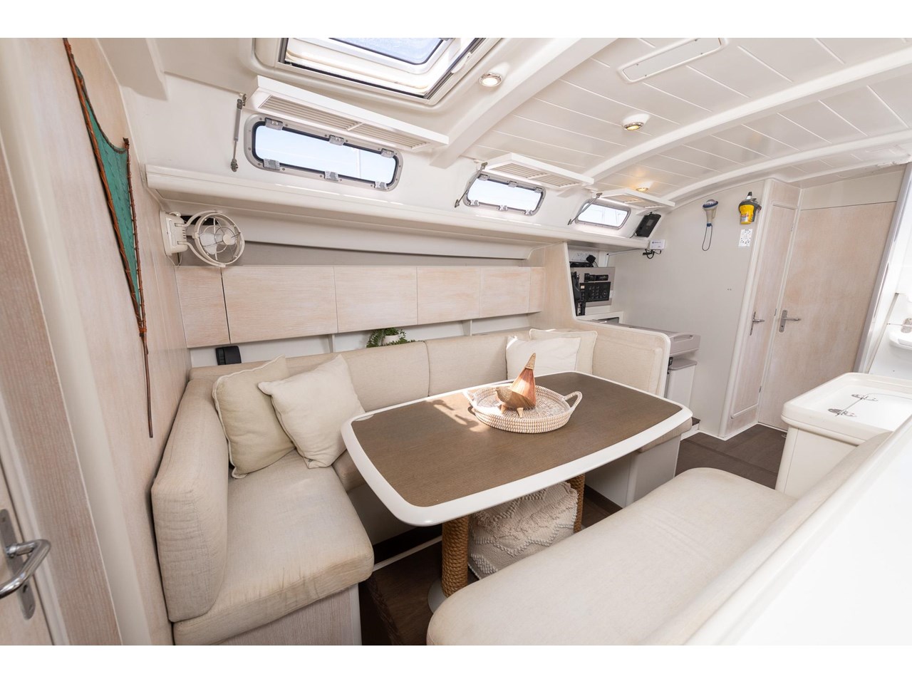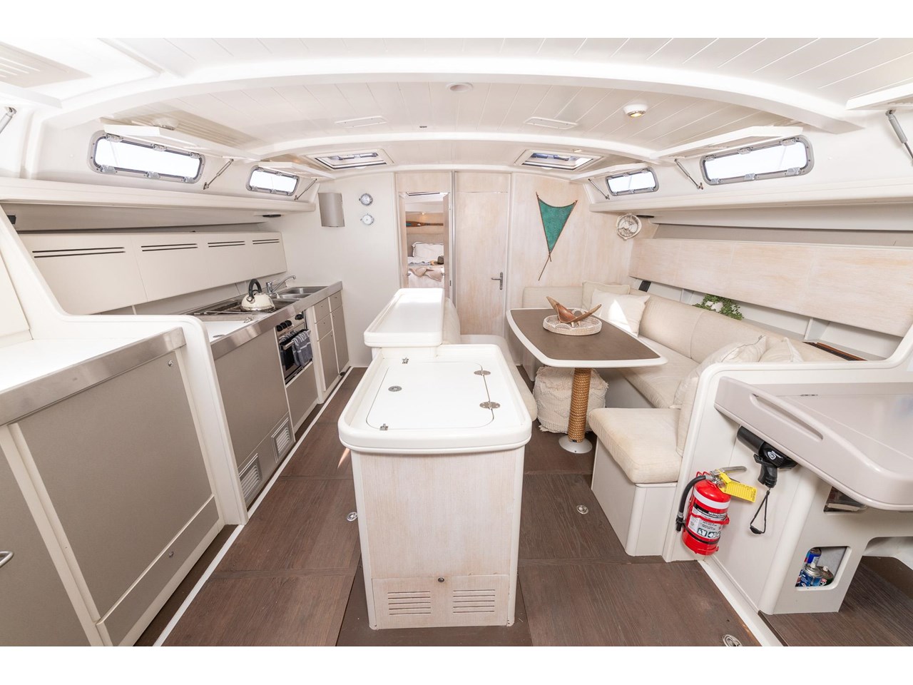 Think of her as a movable beach cottage. Her interior has been completely reimagined, with virtually none of the original Beneteau finishes remaining. The redesign showcases limed and waxed oak veneers, Formica surfaces, and matching painted details, creating a bright, timeless aesthetic. The Schotten & Hansen stained-oak soles lend a warm, natural feel.