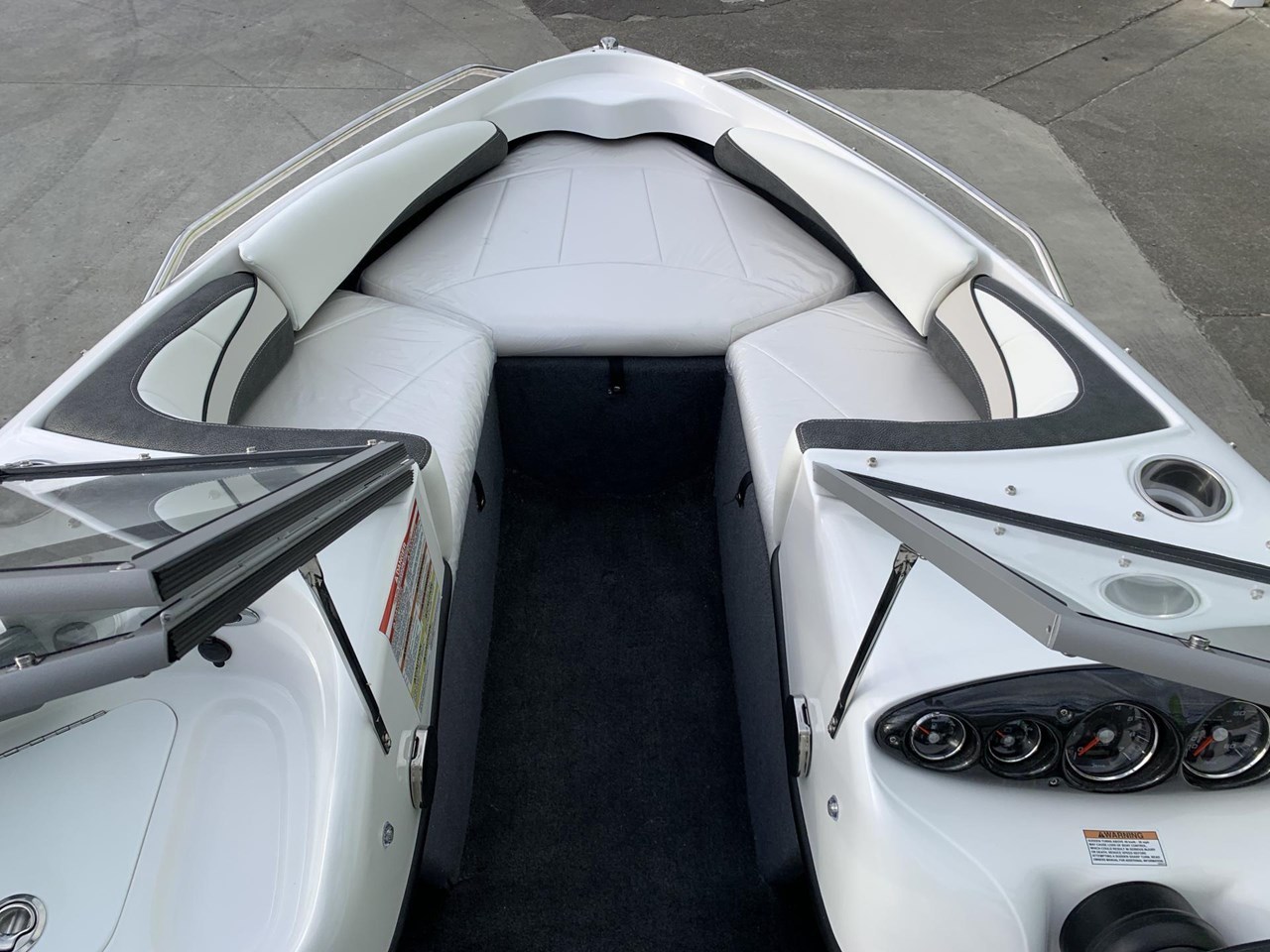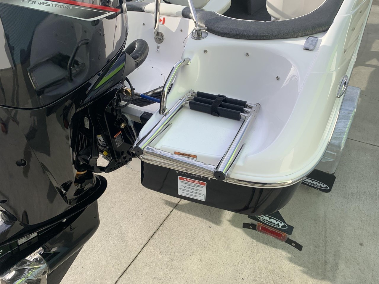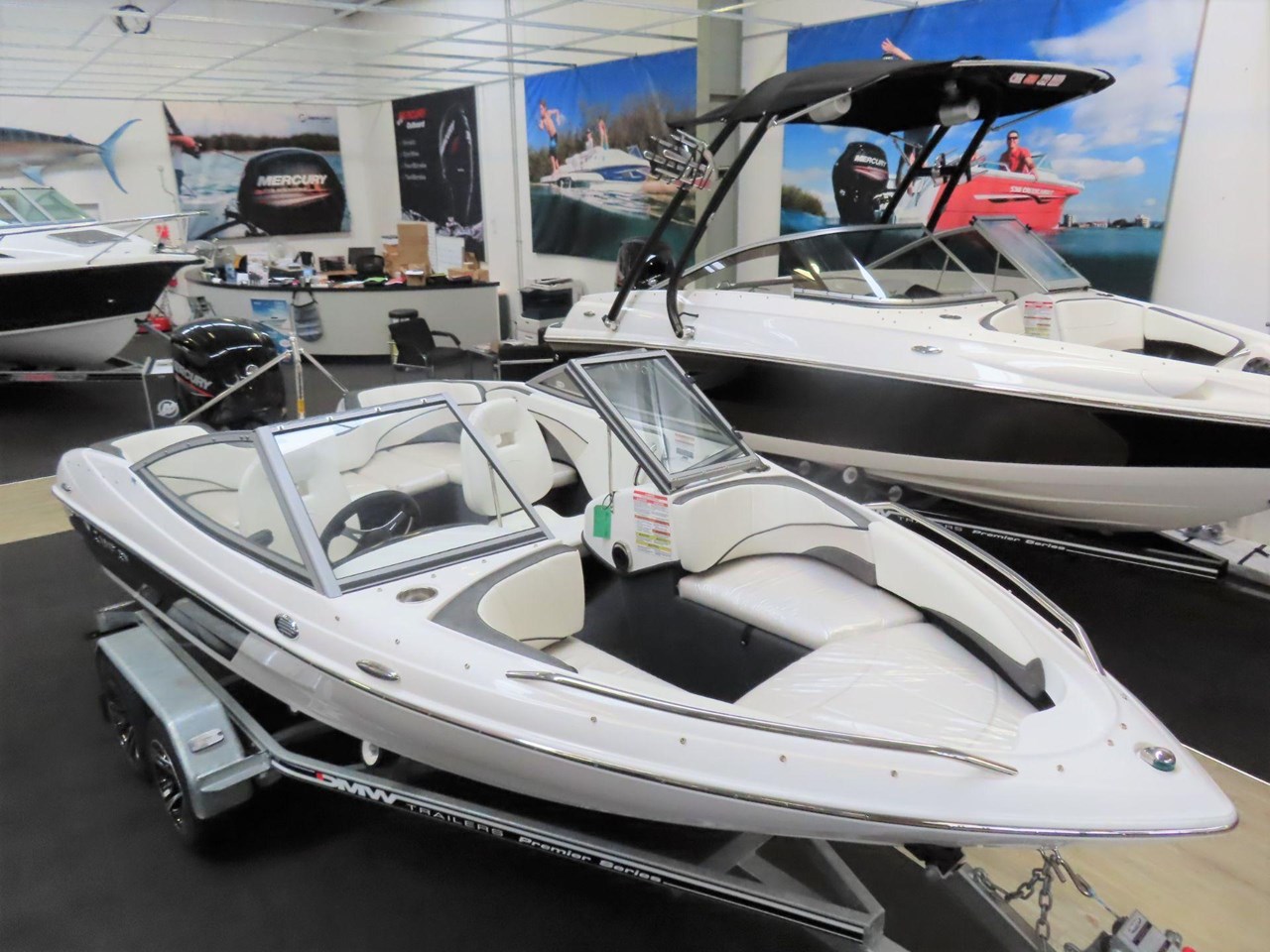 Package Includes: HULL & DECK - Mercury 75HP 4 Stroke Outboard - Three-dimensional woven fiberglass - Kevlar/Eglass laminate reinforcement - Enviro responsible resin - Black Sunbrella® acrylic bow cover - Black Sunbrella® acrylic cockpit cover (over windshield) - Color-coded electrical system w/fused circuit protection - Powerpoint - Automatic bilge pump - Speedometer - In-dash depth sounder - Tilt steering - Stainless steel deck hardware - Stainless steel grab handles - Welded stainless steel bow rails - Stainless steel open base cleat - Flip-down stainless steel swim ladder - Flush-mounted stainless steel pull-out cleats - Removable stainless steel ski tripod - Glove compartment / ice box - Flip-down bucket seats with headrest - Starboard & port with fore & aft slider base - Wraparound stern seating (with storage) - Bow seating w/storage - Marine carpeting - Kicker® KMC100 Media Center, AM/FM, Bluetooth, USB, iPod - 4 speakers - LED cupholders & cockpit lighting package.