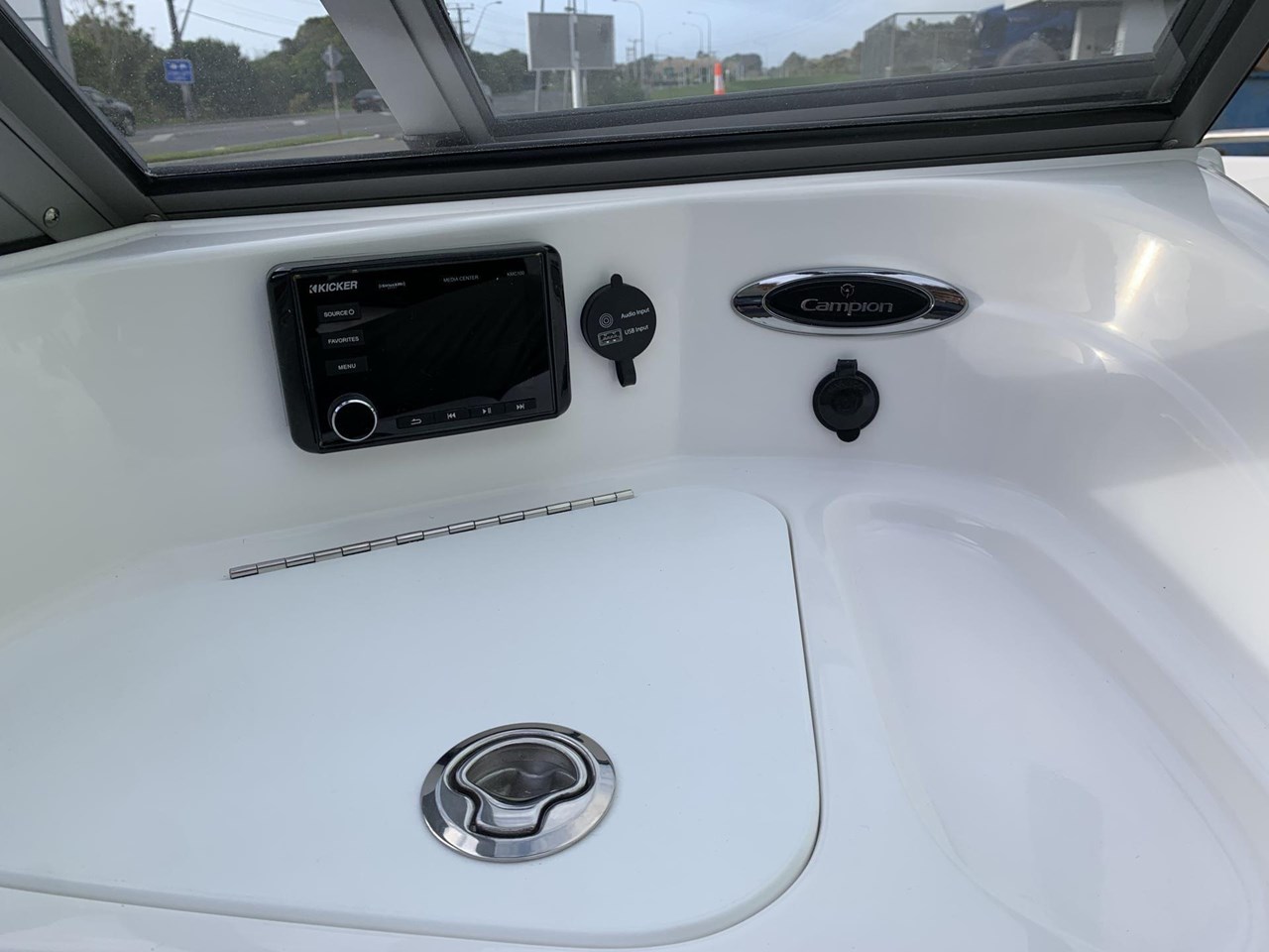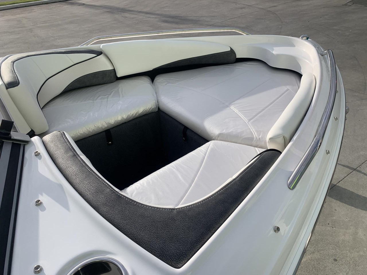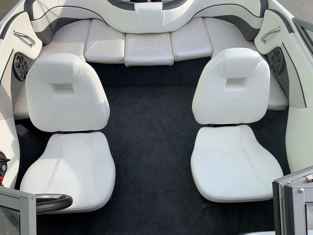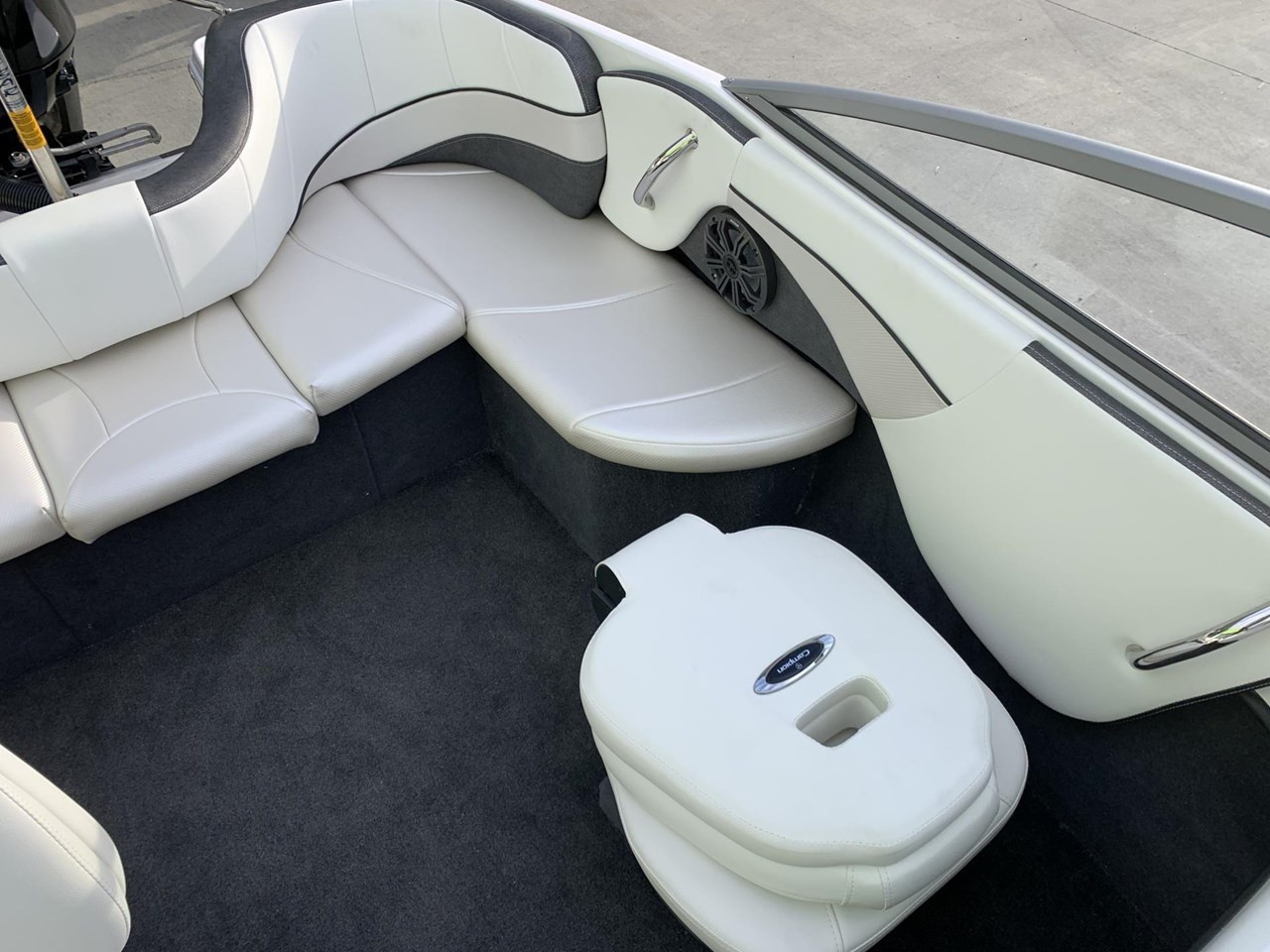 Package Includes: HULL & DECK - Mercury 75HP 4 Stroke Outboard - Three-dimensional woven fiberglass - Kevlar/Eglass laminate reinforcement - Enviro responsible resin - Black Sunbrella® acrylic bow cover - Black Sunbrella® acrylic cockpit cover (over windshield) - Color-coded electrical system w/fused circuit protection - Powerpoint - Automatic bilge pump - Speedometer - In-dash depth sounder - Tilt steering - Stainless steel deck hardware - Stainless steel grab handles - Welded stainless steel bow rails - Stainless steel open base cleat - Flip-down stainless steel swim ladder - Flush-mounted stainless steel pull-out cleats - Removable stainless steel ski tripod - Glove compartment / ice box - Flip-down bucket seats with headrest - Starboard & port with fore & aft slider base - Wraparound stern seating (with storage) - Bow seating w/storage - Marine carpeting - Kicker® KMC100 Media Center, AM/FM, Bluetooth, USB, iPod - 4 speakers - LED cupholders & cockpit lighting package.