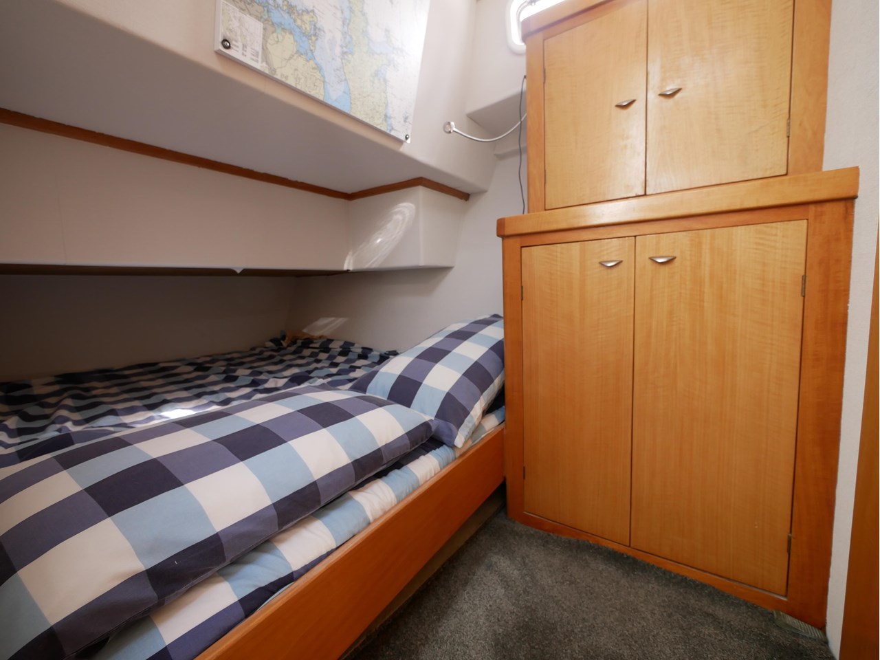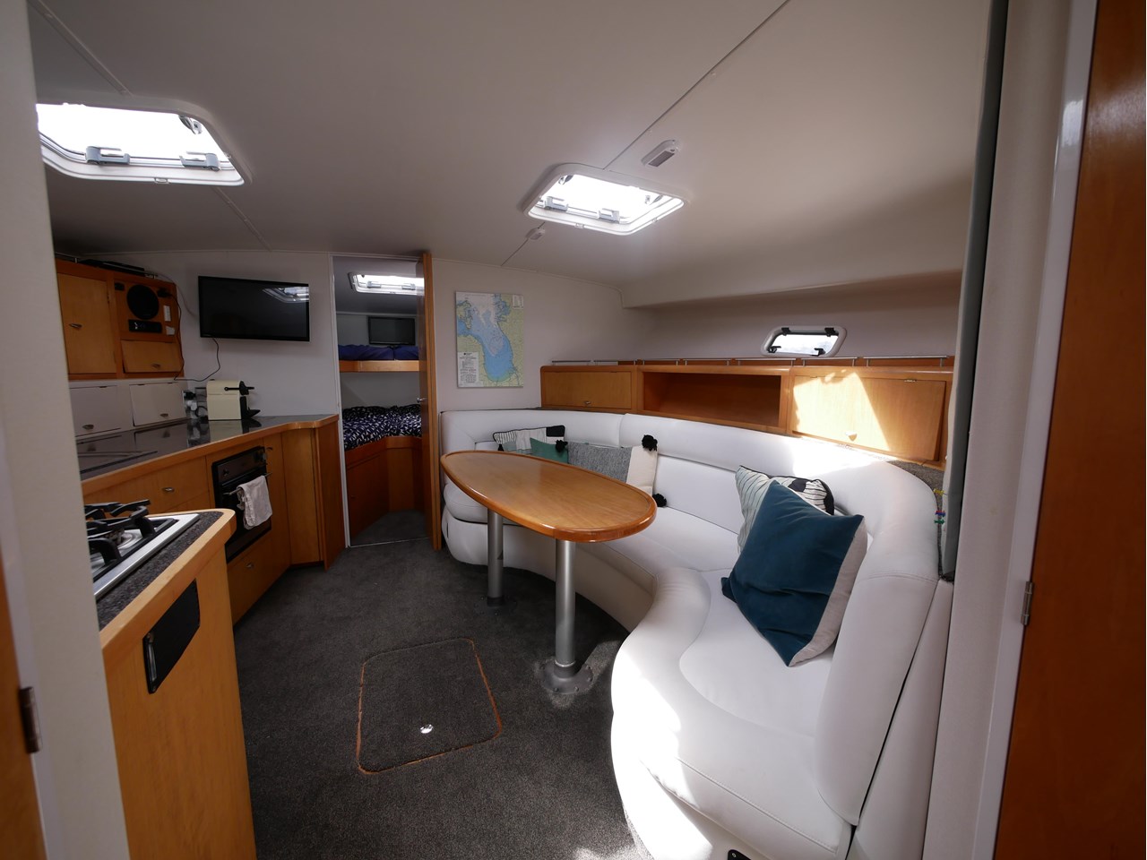 Step inside the spacious saloon, where youll find ample seating and generous accommodation down below across three cabins - two doubles and a twin bunk room forward, providing comfortable berths for up to eight guests. The well-appointed galley is equipped with stove, oven, microwave, fridge, and freezer, making extended stays onboard a breeze.