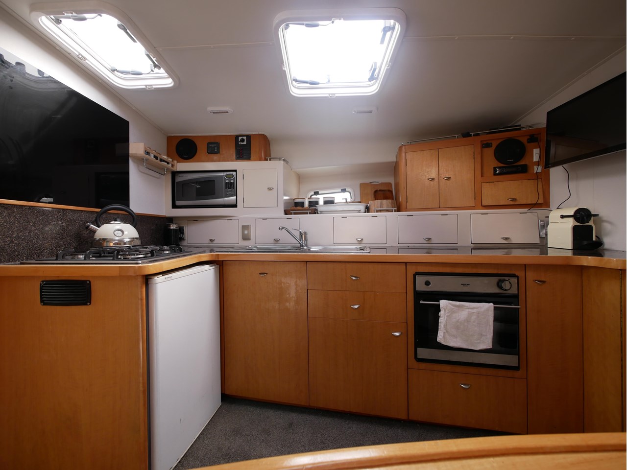 Access is via the large transom which also provides an ideal platform for fishing, swimming and to board/disembark from your dinghy.
