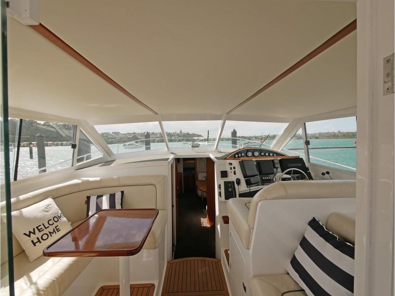 A swinging door and hopper window create a seamless connection between the saloon and cockpit, enhancing the sense of space and making it ideal for entertaining. With her wide beam, the cockpit is large and versatile, perfect for fishing, entertaining, or simply relaxing, while the expansive foredeck offers additional space for sunbathing or enjoying the views.