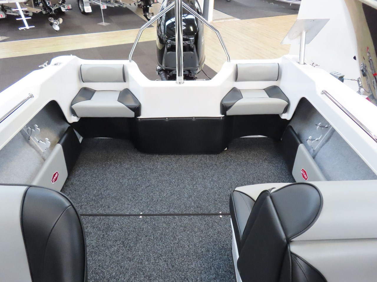 Large Foredeck Cabin Hatch.... Large Separate Access Anchor Compartment.... Moulded Acrylic Top Screen.... Polyurethane Foam Filled Underfloor Bouyancy .... Single Back To back Seats With Vinyl Covered Cushions, Storage Under Seats.... Drivers Bucket Seat With Vinyl covered Cushions With Soft Rider Pedestal.... Fully Lined Cabin And Cockpit Sides.... Full Non Skid Gelcoat Cockpit Liner With UV Stabilised Carpet.... Cockpit Side-Shelves .... Removable Rear Seat With Vinyl Covered Cushion.... Navigation Lights.... Electric Bilge Pump.... Water Proof Switch Panel And Wiring Loom .... Interior Cabin Light And 12 Volt Accessory Socket.... Bow Sprit.... Full Wrap Around Stainless Steel Bow Rail.... Folding Boarding Ladder.... Stainless Steel Grab Rails.... Stainless Steel Rod Holders And Rod Racks .... Stainless Steel 145 Litre Underfloor Tank.... Large Underfloor Storage Compartment For Water Skis And Accessories.... Internal Gelcoat Cockpit Liner With Non-Skid Tread For Easy Wash.... Removable Carpet, Domed In Removes Easily For Cleaning.... Stainless Steel U-Bolts (x2) Tie-Down Points. NOTE: only for Transom Tie-Downs, NOT FOR TOWING.....
