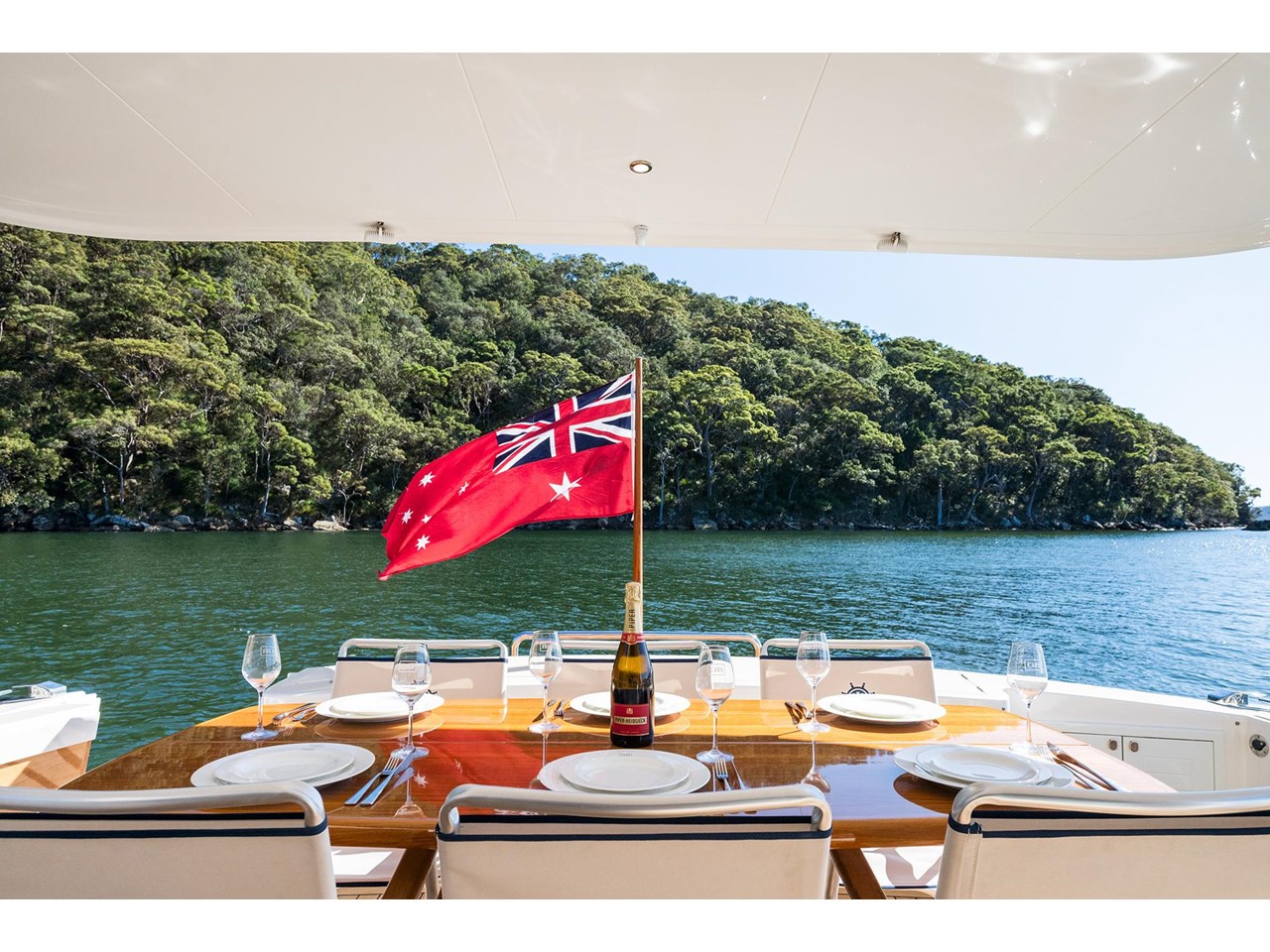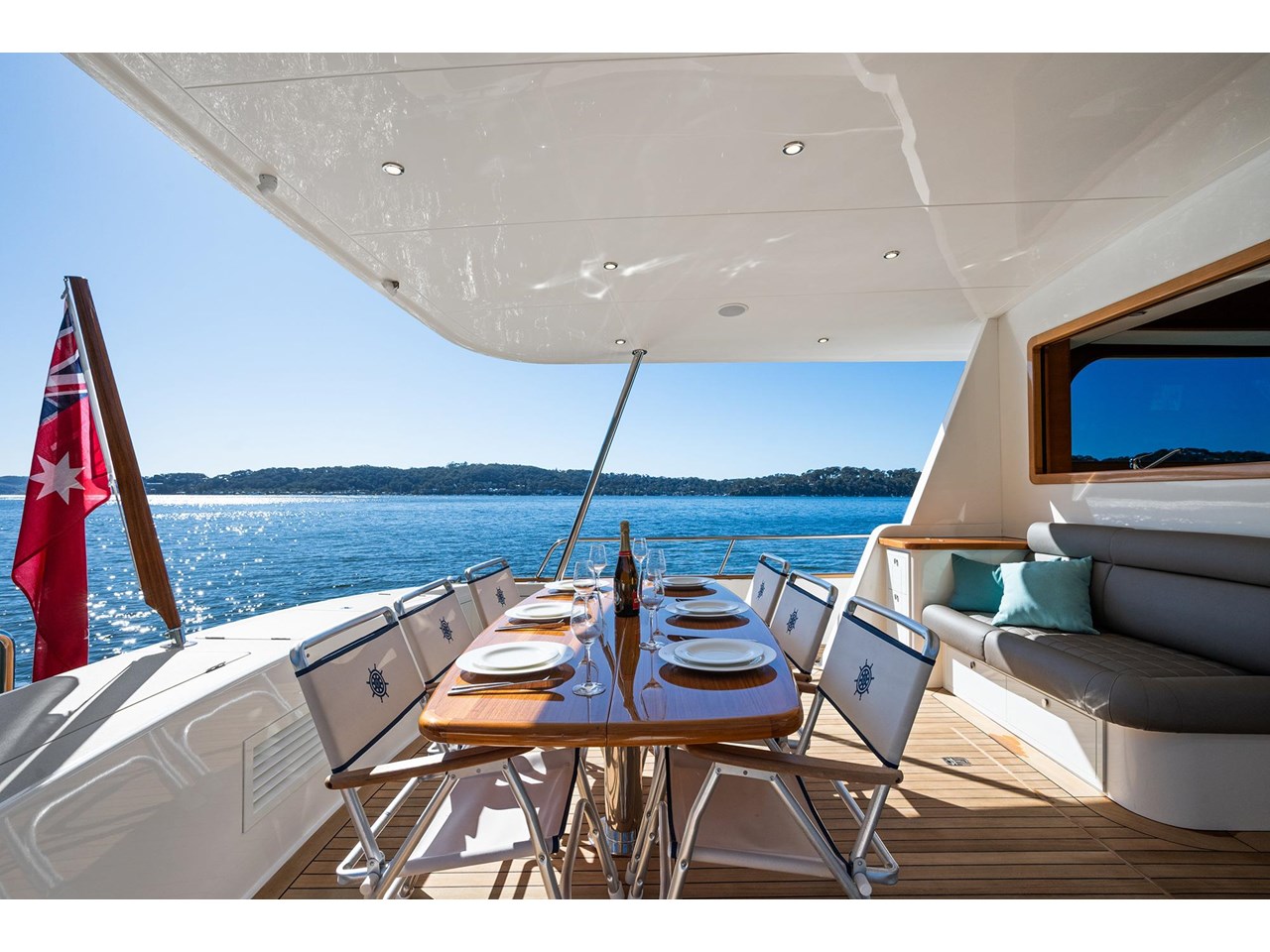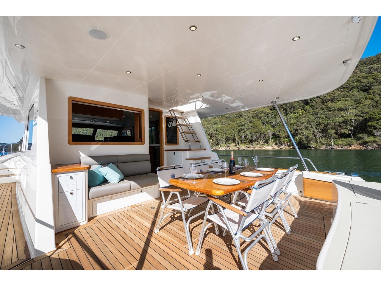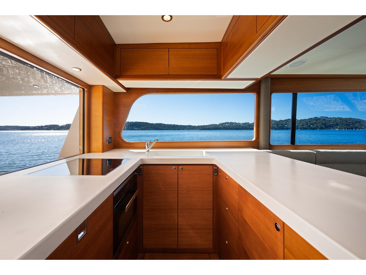 A large U-shaped aft galley with a drop-down window to the expansive covered aft deck adds to the vessels practicality. The galley is fitted with Isotherm and Vitrifrigo fridge and freezers, Miele microwave oven and convenient Hi-lo overhead galley cupboards that add storage with style.