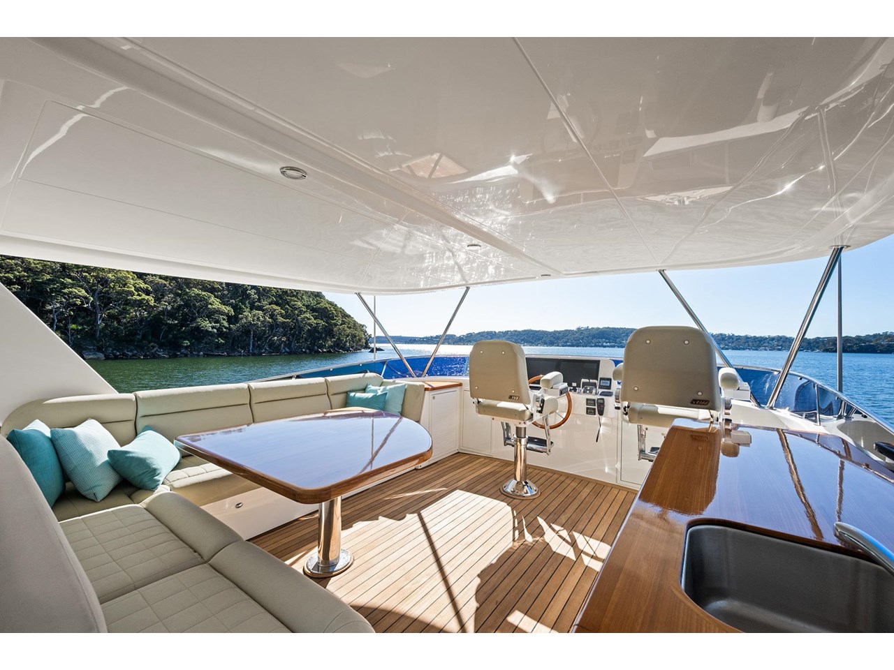 The spacious flybridge features twin helm seats, a generous sunbed with added storage, a forward-facing L-shaped settee, a fixed teak table, lockers, and under-seat storage. It also has a wetbar that works as an outdoor kitchen, a Vitrifrigo fridge, and above all, a stunning 360-degree view of the surroundings.