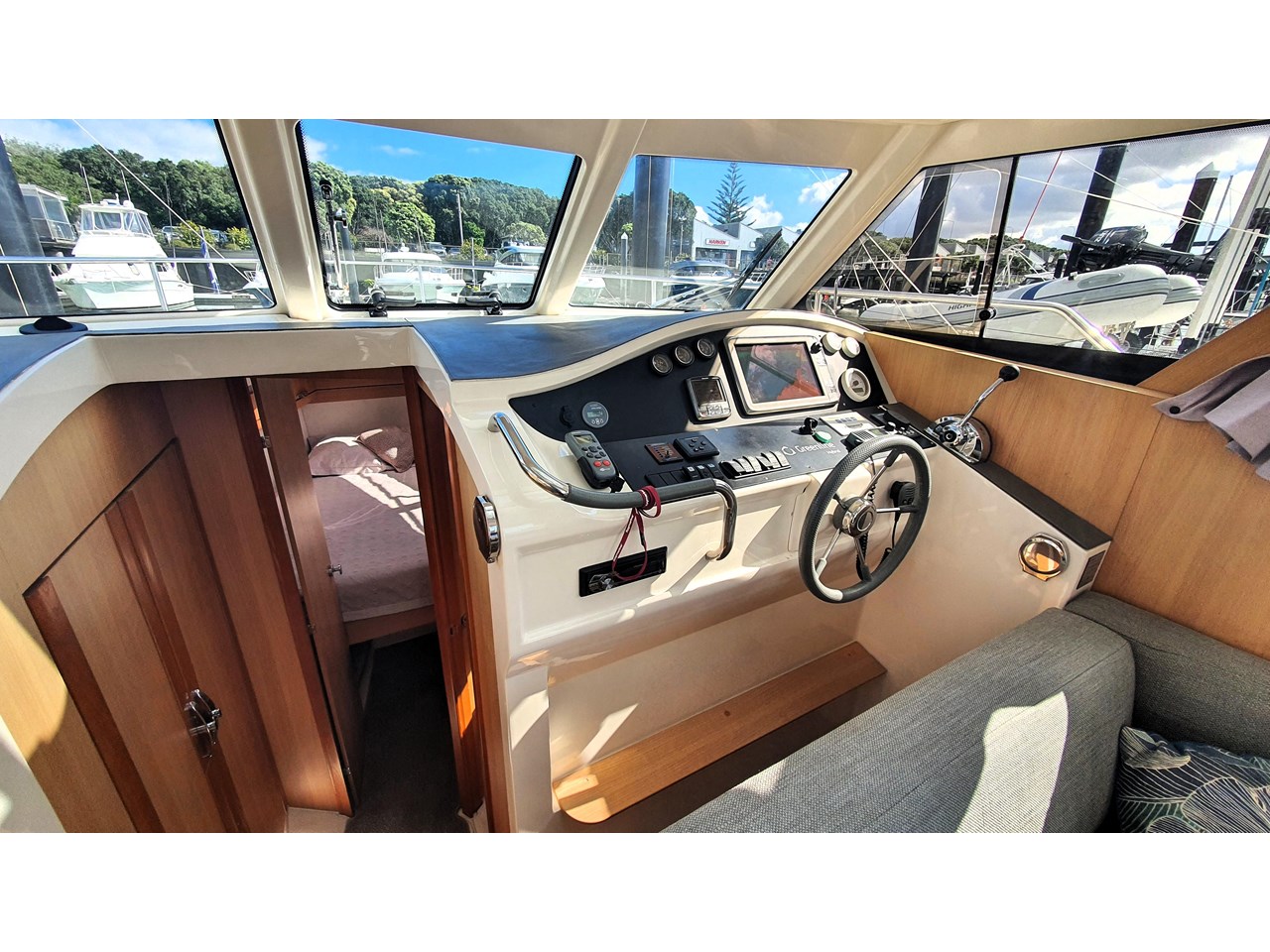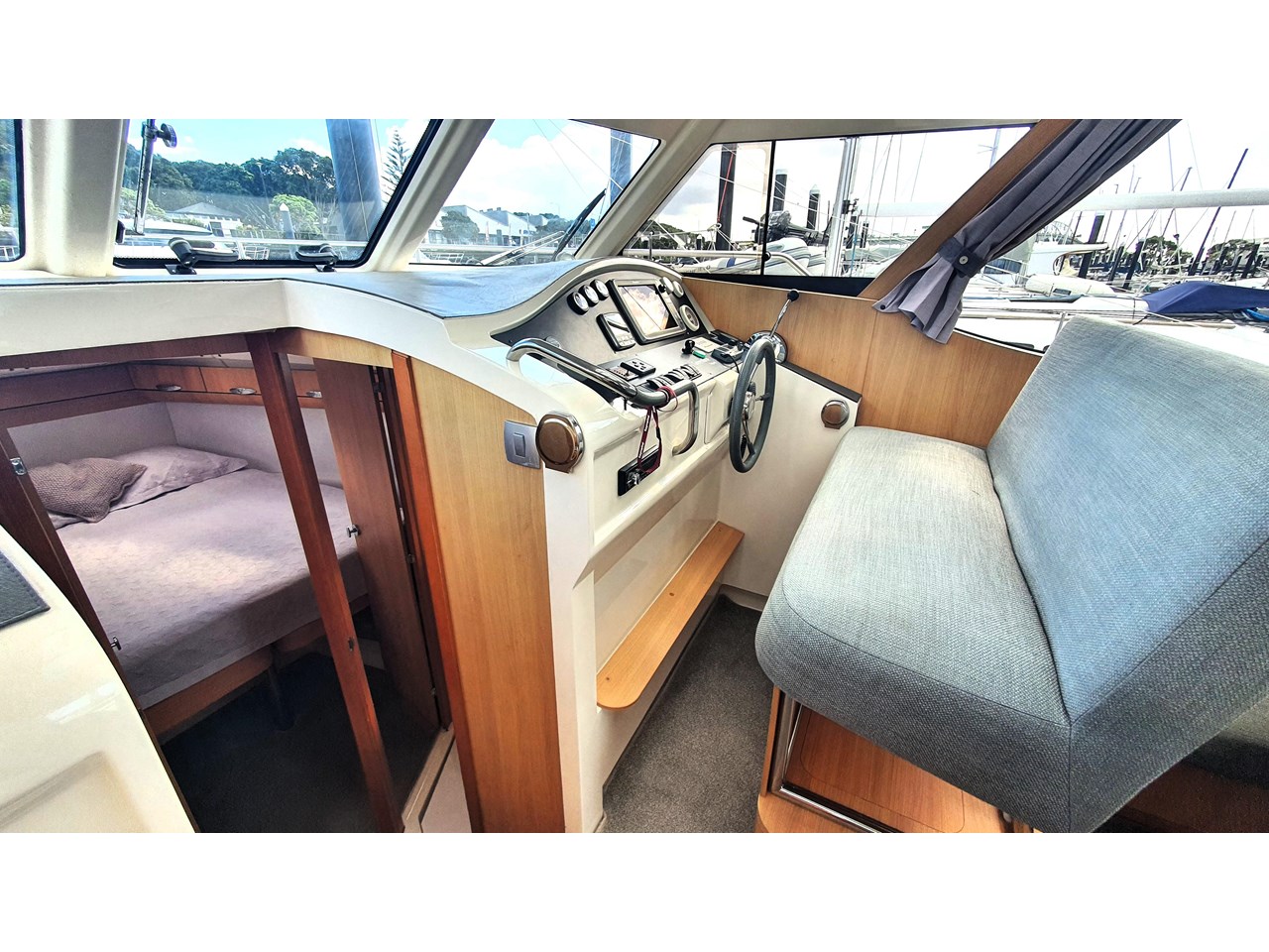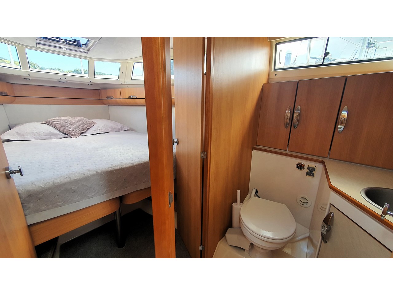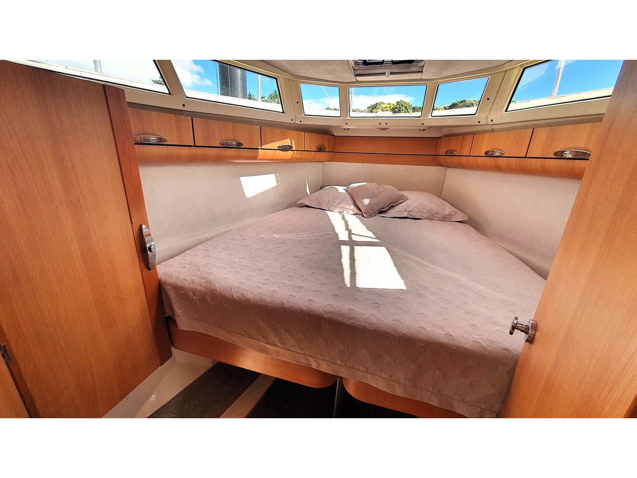 There is a master cabin with with ensuite access to the high volume washroom, head and shower. The bed frame can be split to allow a double shape, or two singles. Currently there is an upgraded double mattress fitted which provides more comfort, but both sets mattresses will be included with the sale. The cabin area is light and has excellent views out due to the abundance of windows. The boat has also been designed with plenty of good storage locations throughout.