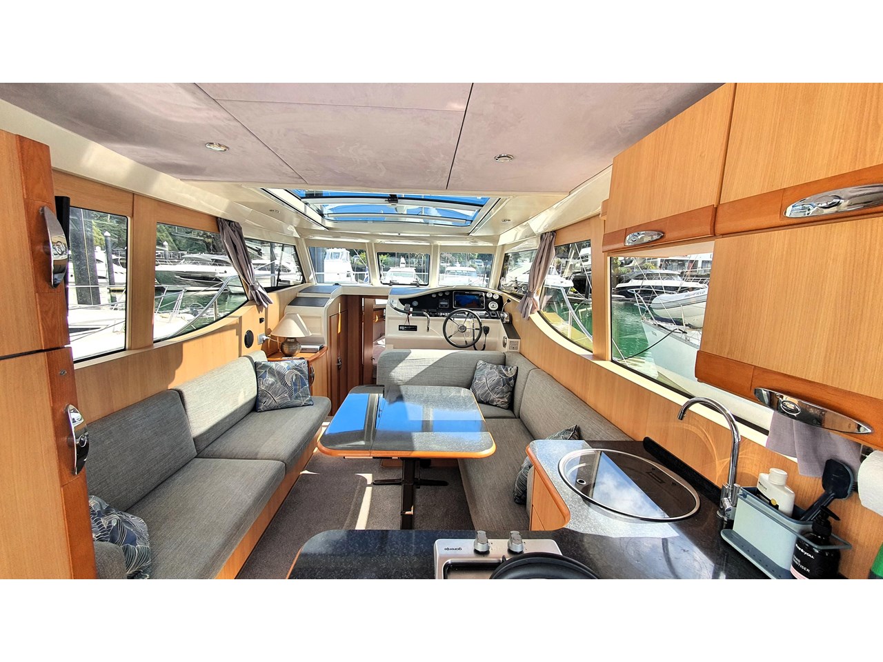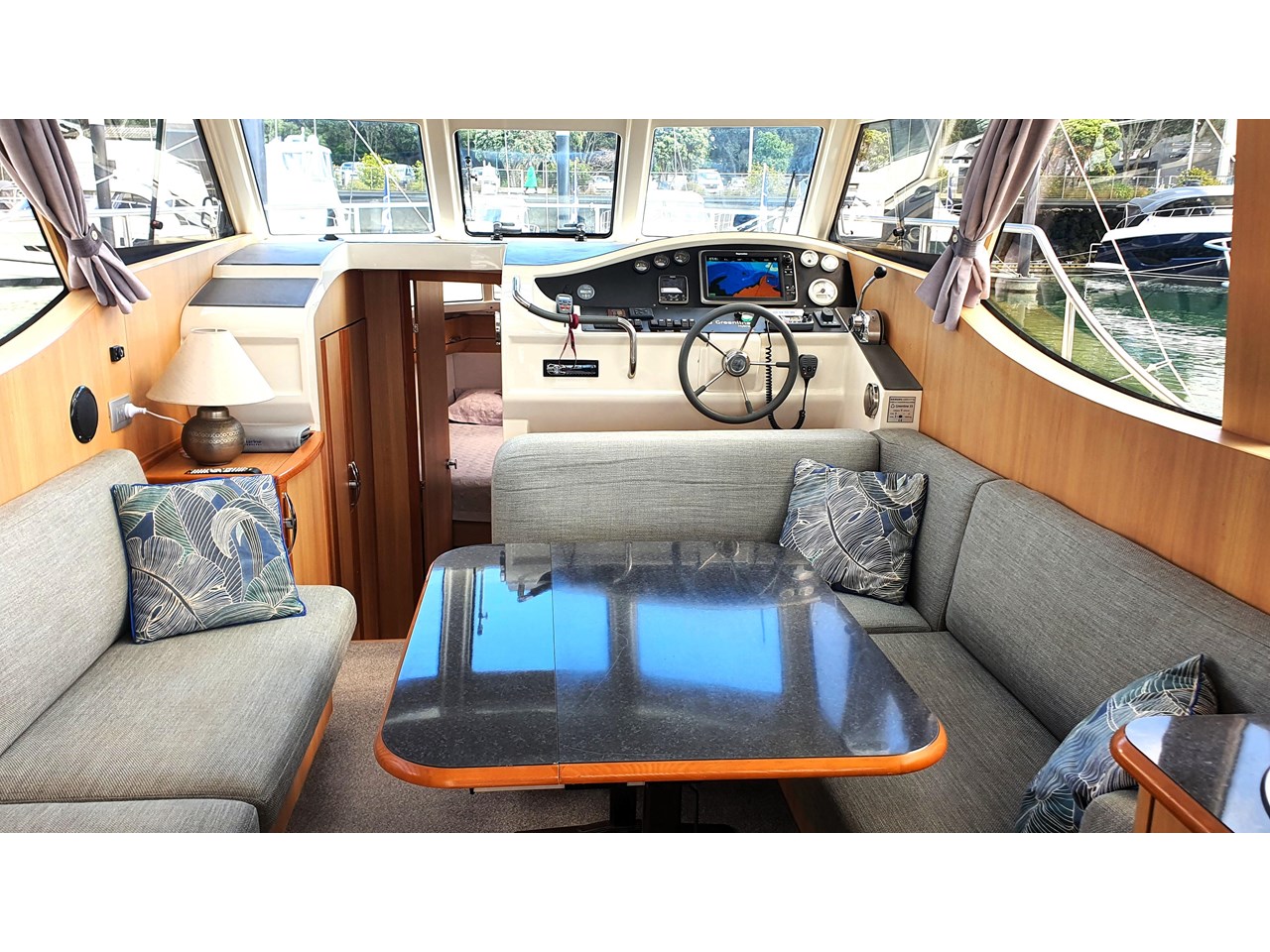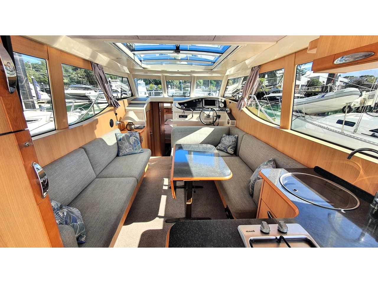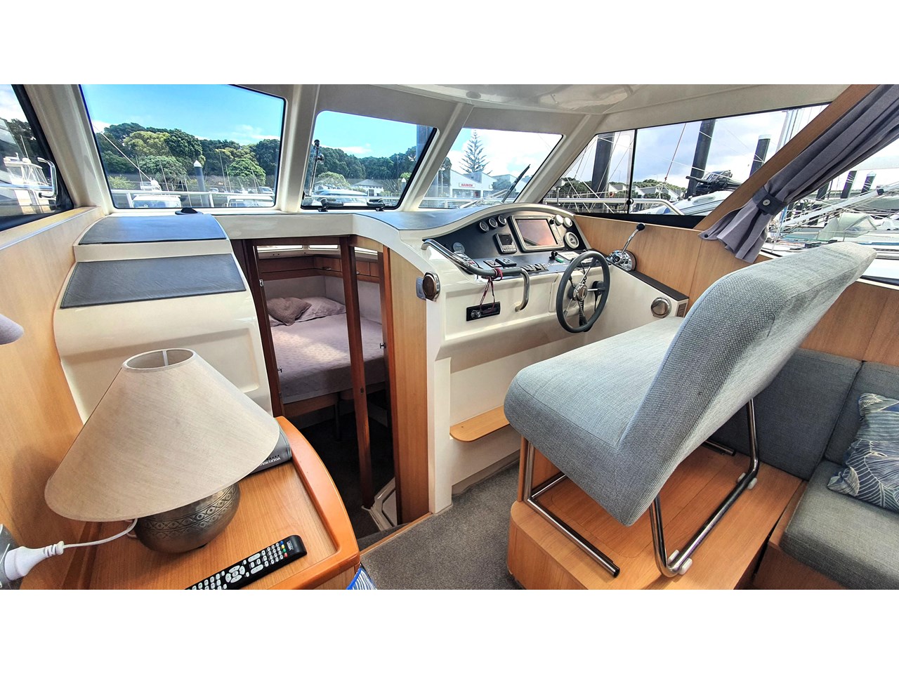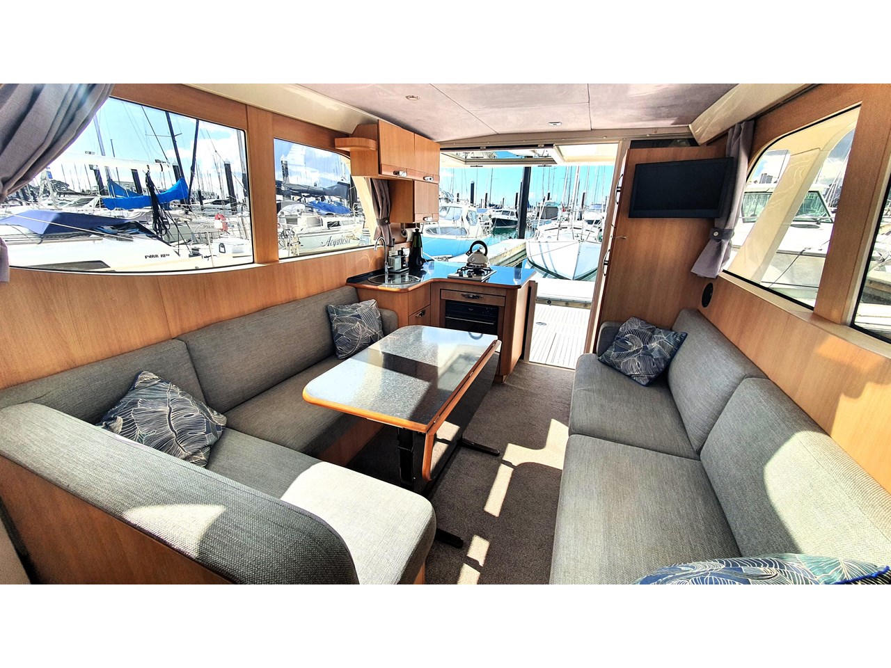 There is a master cabin with with ensuite access to the high volume washroom, head and shower. The bed frame can be split to allow a double shape, or two singles. Currently there is an upgraded double mattress fitted which provides more comfort, but both sets mattresses will be included with the sale. The cabin area is light and has excellent views out due to the abundance of windows. The boat has also been designed with plenty of good storage locations throughout.