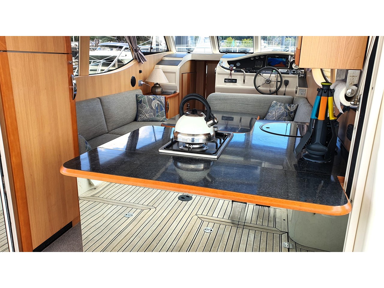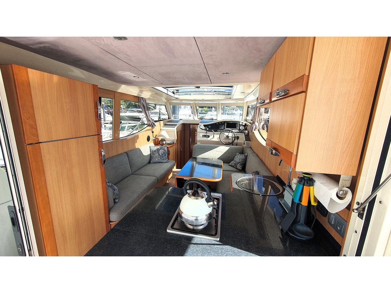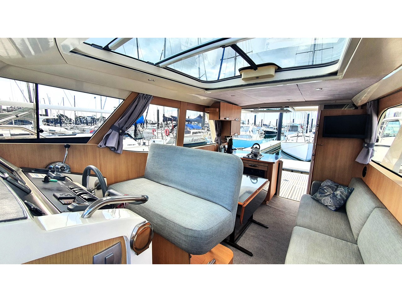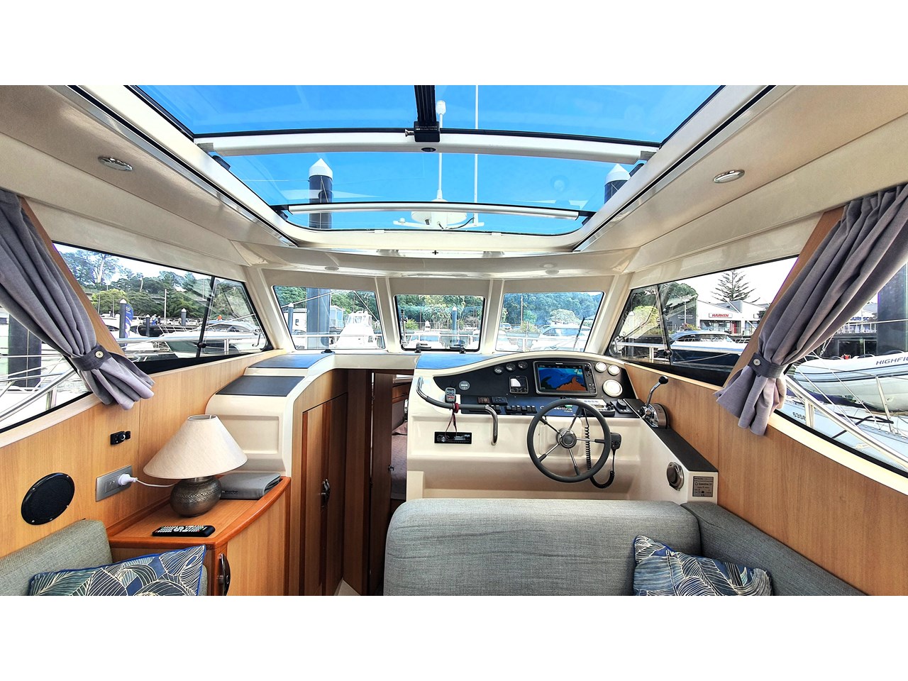 There is a master cabin with with ensuite access to the high volume washroom, head and shower. The bed frame can be split to allow a double shape, or two singles. Currently there is an upgraded double mattress fitted which provides more comfort, but both sets mattresses will be included with the sale. The cabin area is light and has excellent views out due to the abundance of windows. The boat has also been designed with plenty of good storage locations throughout.