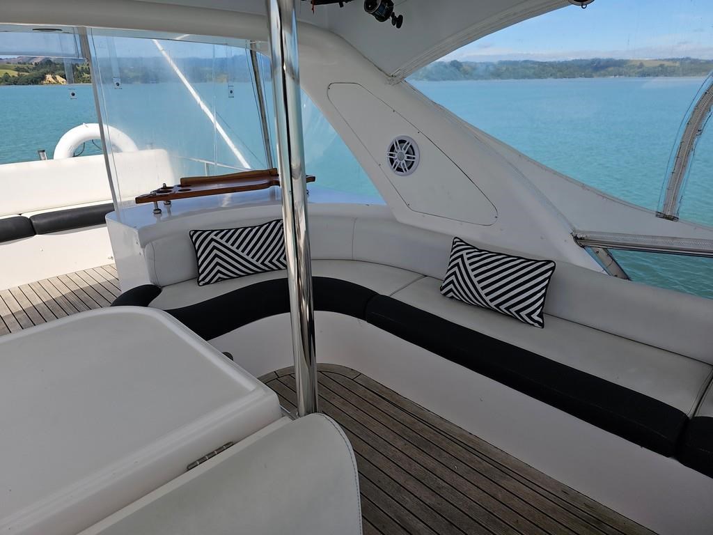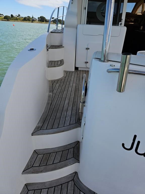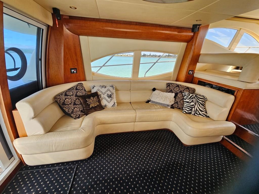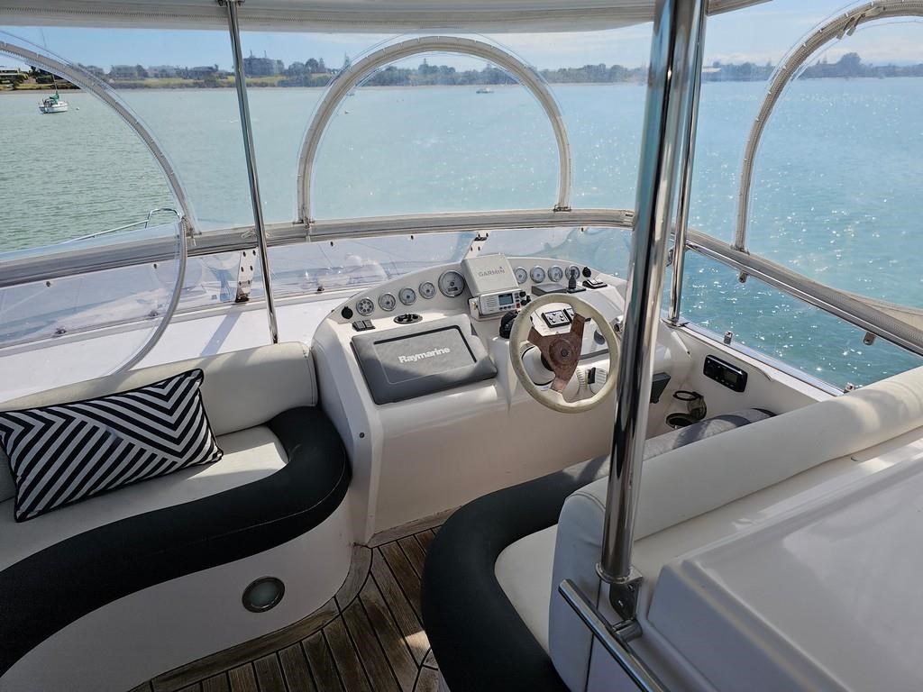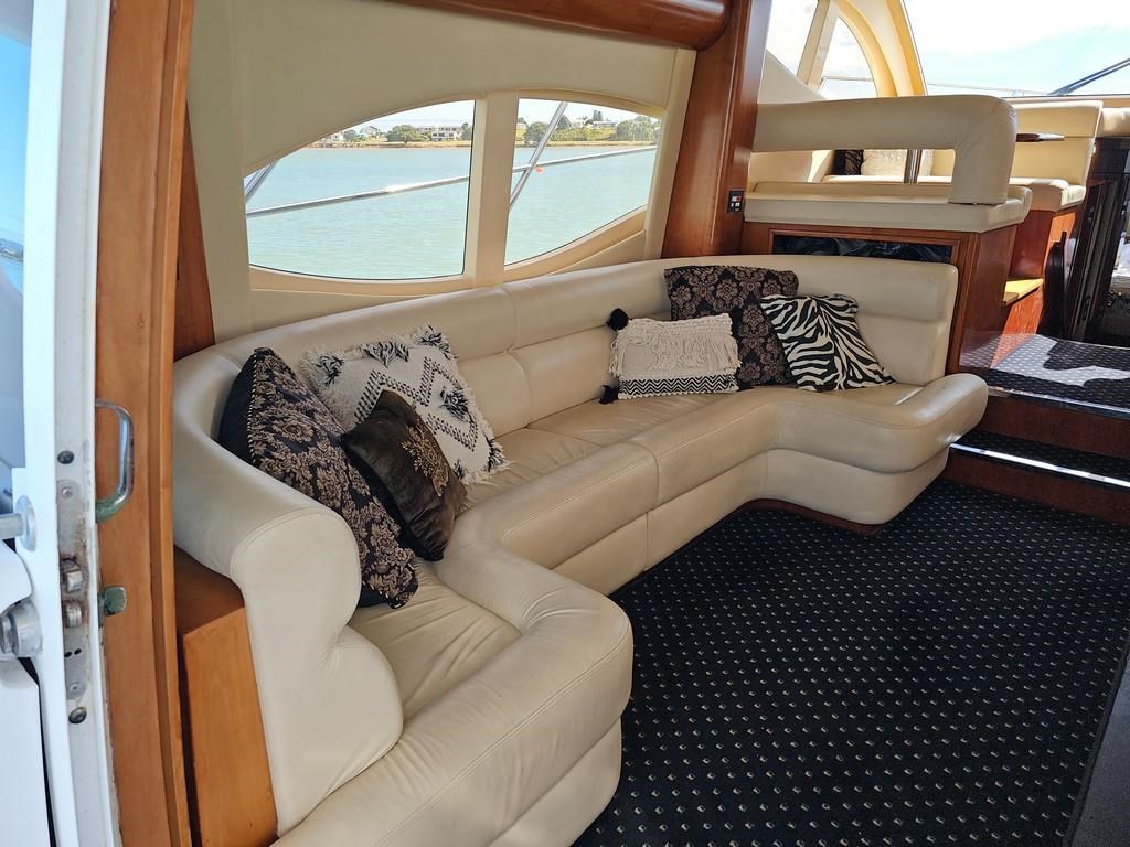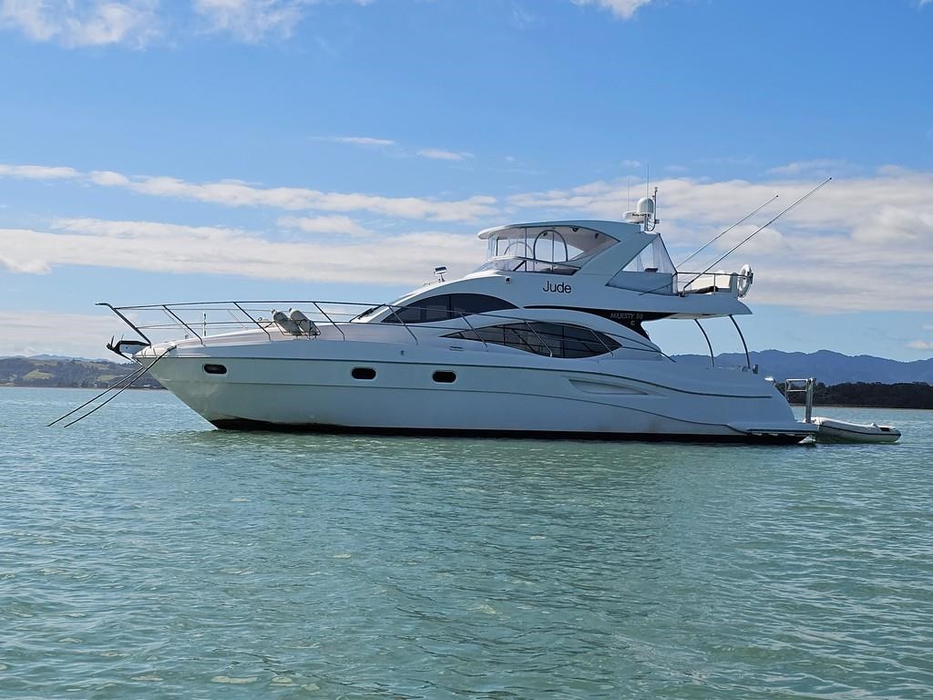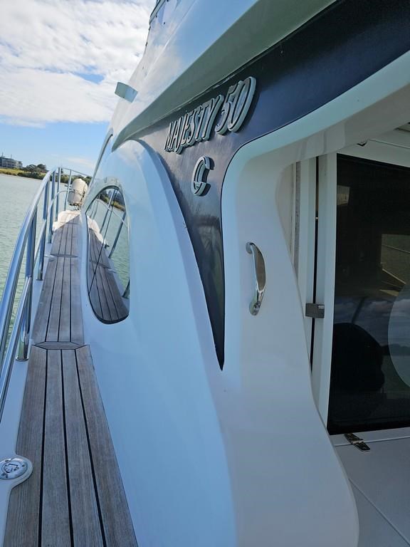Experience luxury and performance with the Gulf Craft Majesty 50, a 16-meter fibreglass motor yacht built in 2006. Powered by twin Volvo D9 575hp diesel engines with only 1700 hours, this vessel offers a smooth cruise at 20 knots and a top speed of 28 knots. Featuring a solid GRP hull, spacious 3-cabin, 2-bathroom layout including a master cabin with ensuite, and high-end amenities such as a 17 KVA Northern Lights genset, solar charging, air conditioning, and advanced Raymarine electronics. Enjoy teak decks, a flybridge with full helm and lounge areas, a large swim platform with underwater lights, and a water maker for extended cruising comfort. Perfectly specced for the luxury market and ready for viewing in Ohiwa Harbour, this Majesty 50 combines style, comfort, and reliable performance for discerning boaters.
