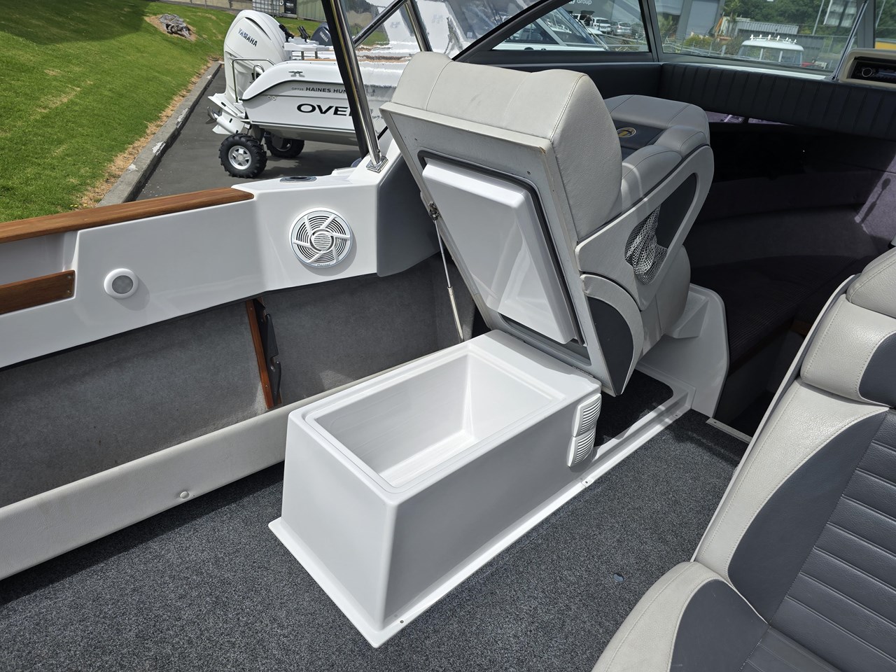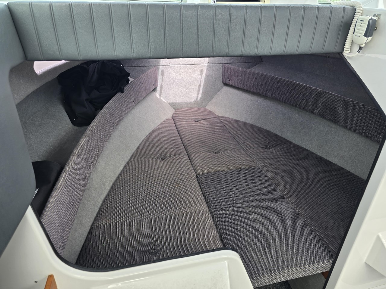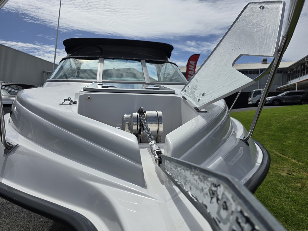 Comfort and liveability are exceptional, with a cabin infill squab, electric toilet, and under-seat freezer making extended trips and overnight stays genuinely enjoyable. The full bimini, canopy, clears, rod holders, and bimini backdrop provide outstanding weather protection and on-water versatility.