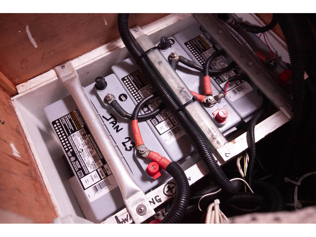 There are three house batteries running a 12 volt system for lights and equipment. Also 1 dedicated x start battery for engine.