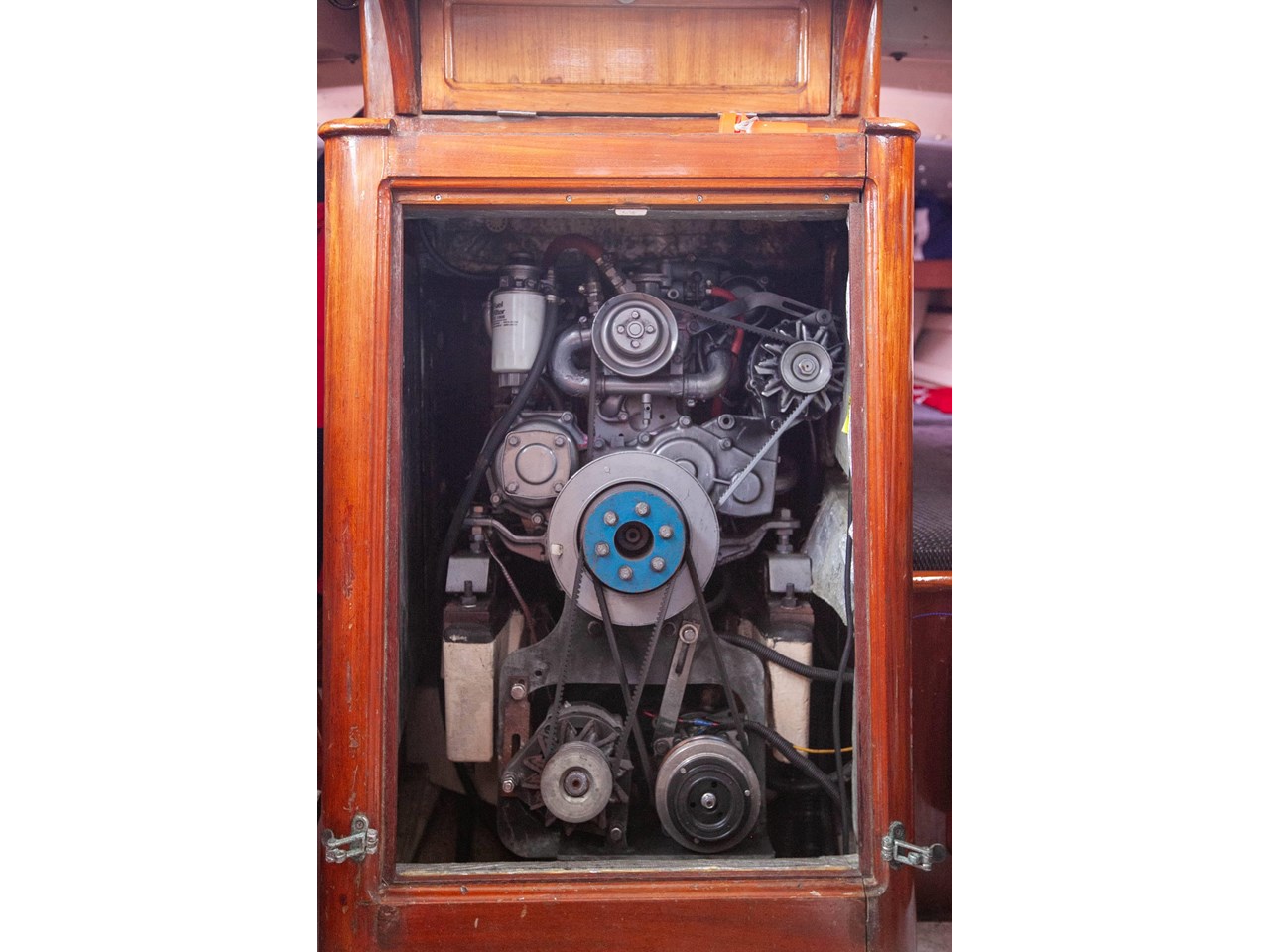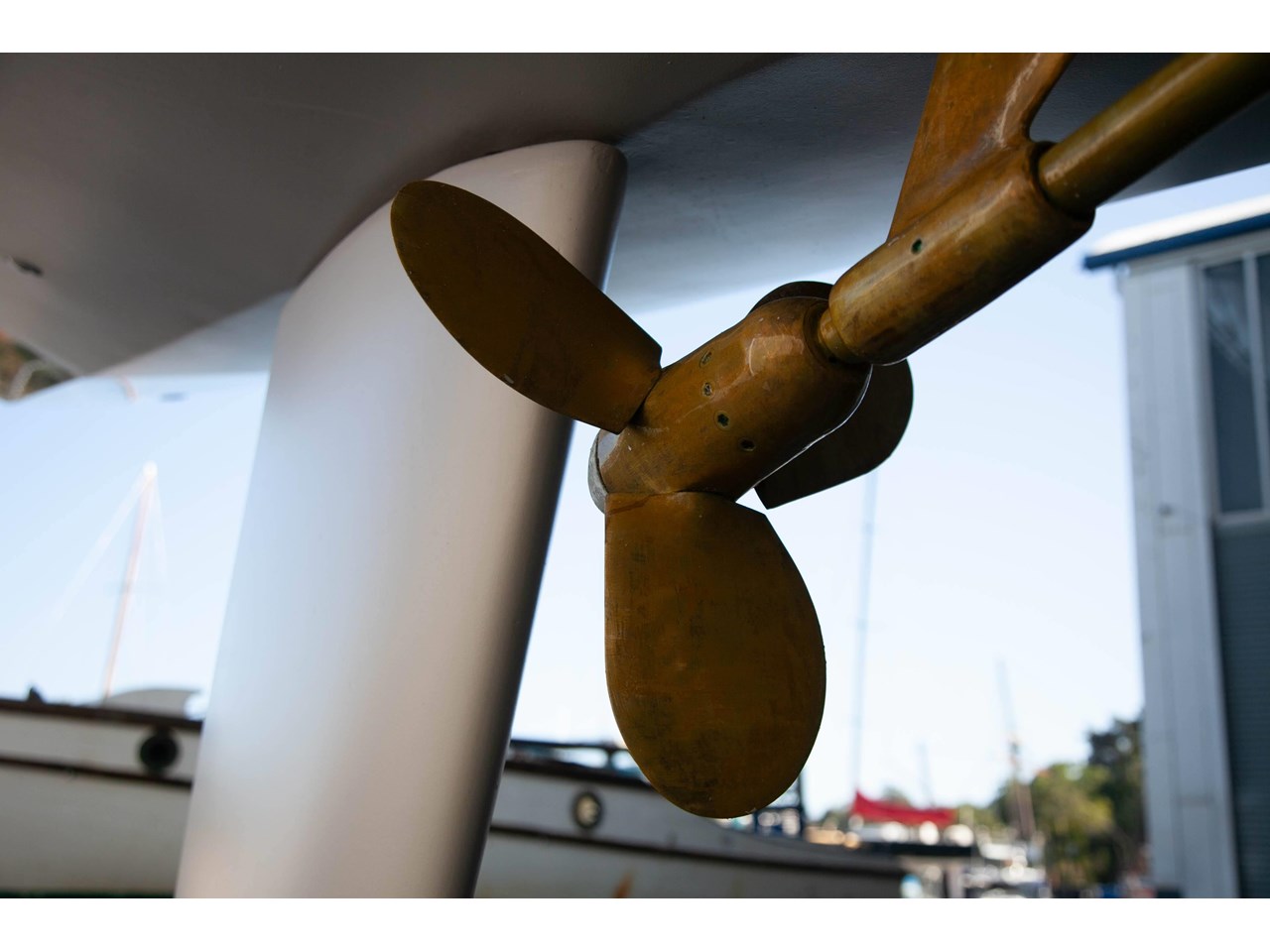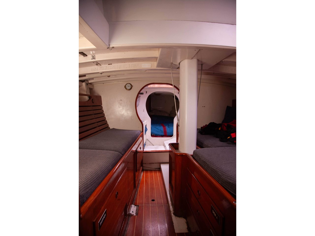 The solid lead keel is moderate and through bolted with bronze studs to the deadwood. Removed and refitted in 2005.