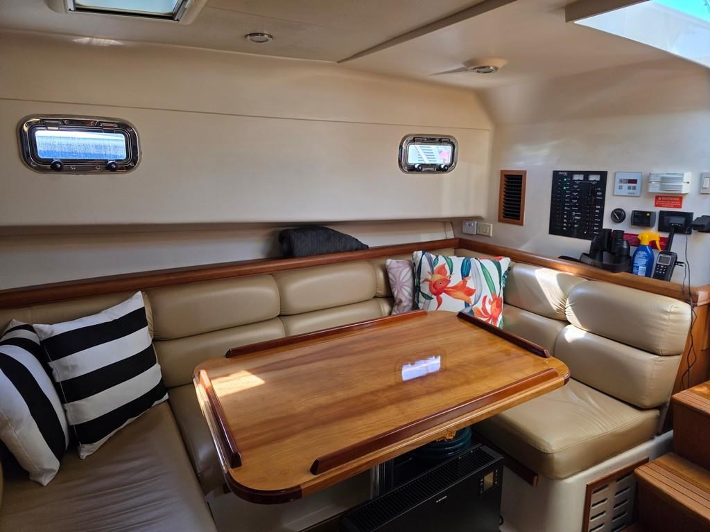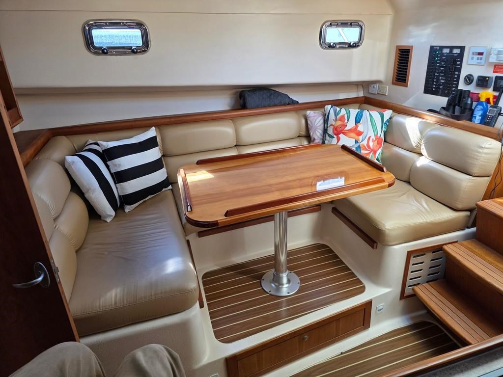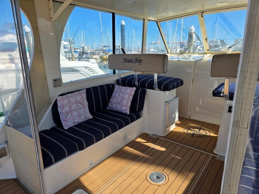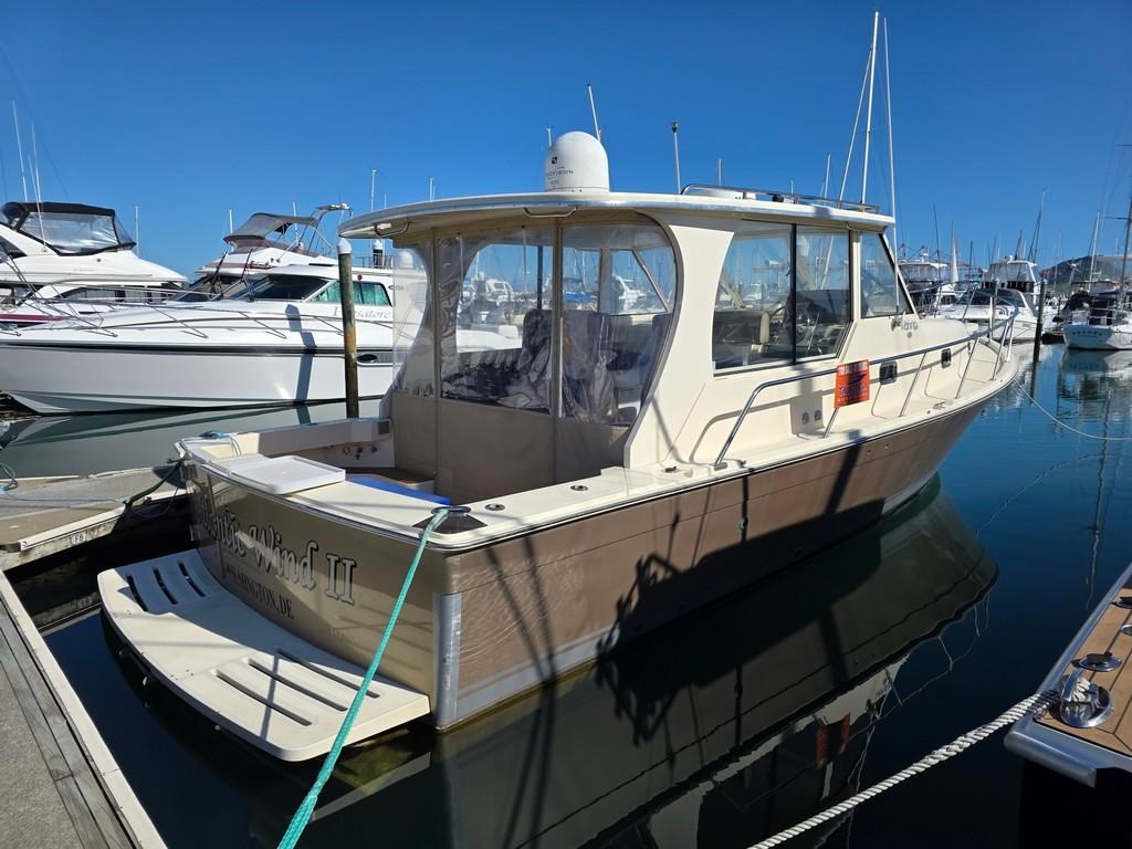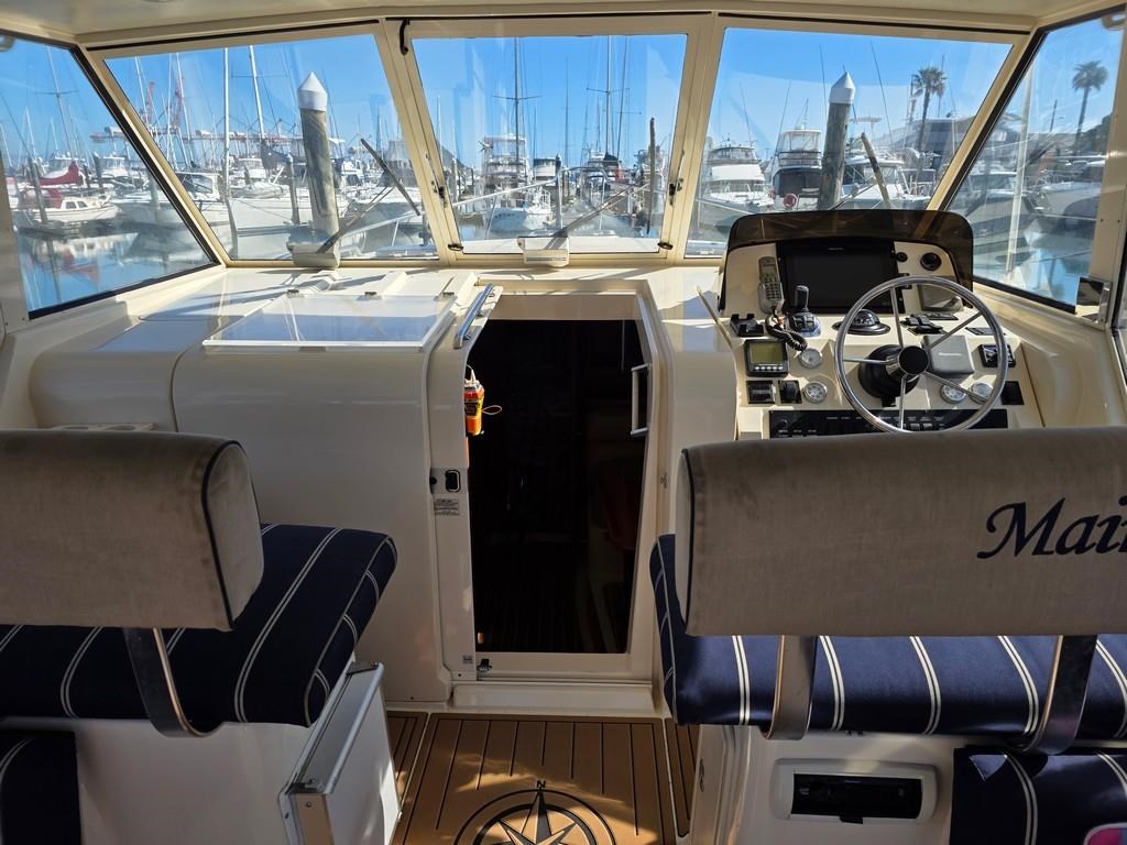 The Mainship Pilot 34 (2006) is a well-crafted 11.5m fibreglass power boat designed for comfort and ease of handling. Powered by twin Volvo D4 260hp IPS drives with approximately 763 hours, it offers a smooth cruising speed of 15-18 knots and a top speed of 24 knots. This vessel features a spacious helm with advanced Volvo joystick docking controls, Raymarine 12 touchscreen navigation, and electric capstan for effortless operation. The social layout includes a saloon with dinette and leather seating convertible to a double bed, air conditioning, satellite TV, and a fully equipped galley with a 2-burner electric hob, microwave, and fridge/freezer. The lock-up shower and Vacuflush toilet with holding tank add to onboard convenience. With a 900L fuel capacity and 200L fresh water, plus a 8 KVA Kabota genset, this Mainship Pilot 34 is a tidy, ready-to-go sedan vessel perfect for summer cruising and entertaining.