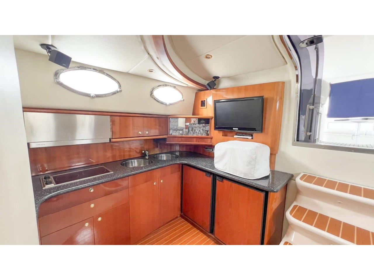 Spacious cockpit with wet bar, seating, and full-width hydraulic swim platform;