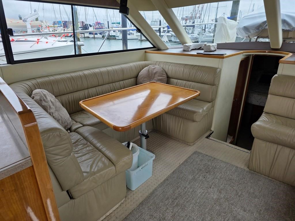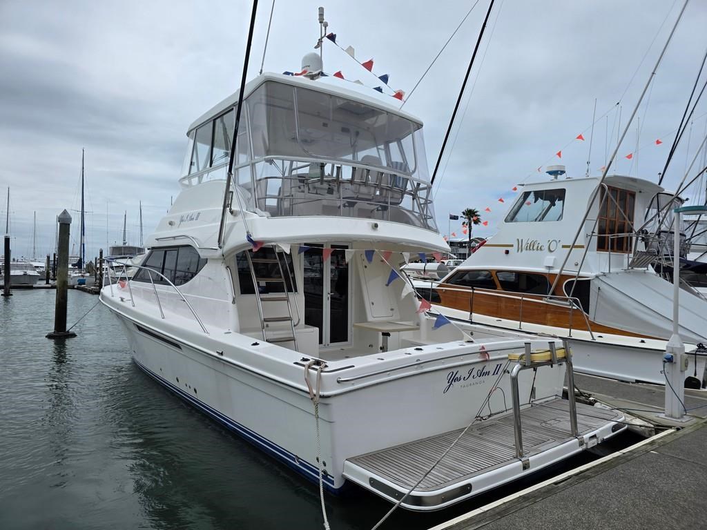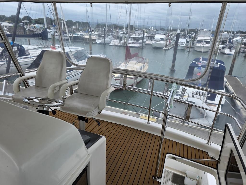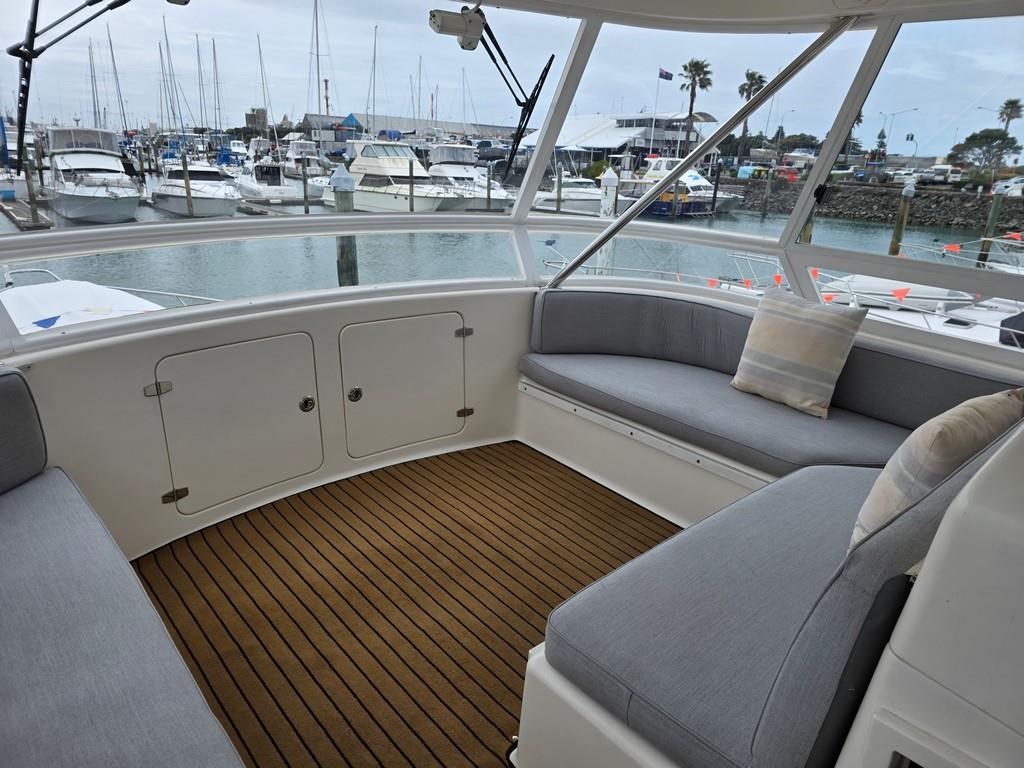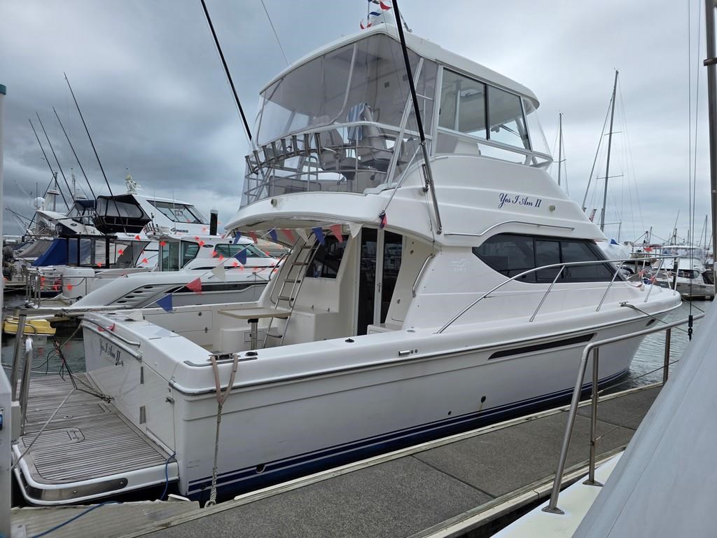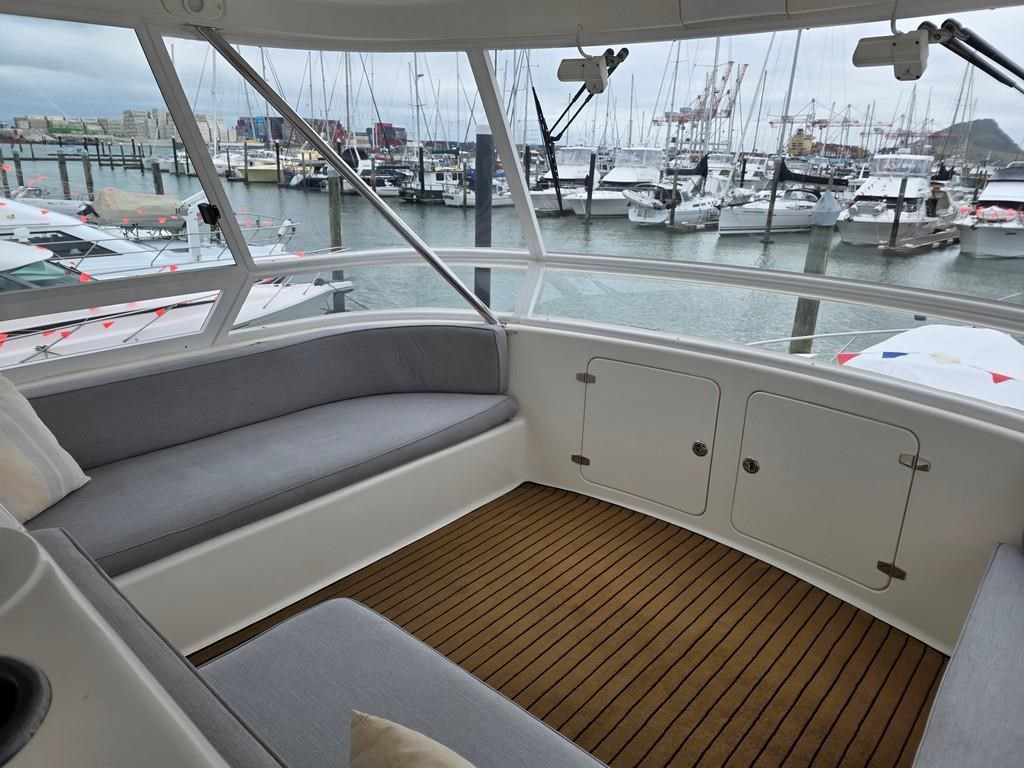 The Mustang 43 Flybridge Cruiser (2007) is a versatile and spacious powerboat perfect for family cruising and big game fishing. Measuring 14.15 meters in length with a 4.61-meter beam and a 1-meter draft, this fibreglass vessel offers a robust GRP construction and weighs approximately 18 tonnes when laden. Powered by twin Cummins QSC 500hp diesel engines with shaft drive, it delivers a comfortable 21-knot cruise speed and a top speed exceeding 27 knots. The boat features an enclosed flybridge, bow thruster, and a well-equipped galley with modern appliances including a dishwasher and multiple fridges/freezers. Accommodation includes two cabins with an island bed and ensuite, a guest cabin with two single beds, and convertible sleeping areas in the saloon and flybridge. Additional amenities include Furuno Navnet navigation systems with autopilot and radar, a Victron charger/inverter, an 11.5 KVA Onan generator, and fishing gear such as game poles and a live bait tank. This Mustang 43 has been meticulously maintained by its original NZ owner and is in fantastic condition, making it an excellent choice for both leisure and sport fishing enthusiasts.