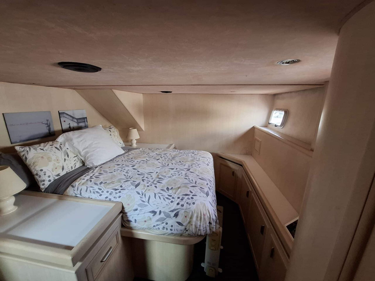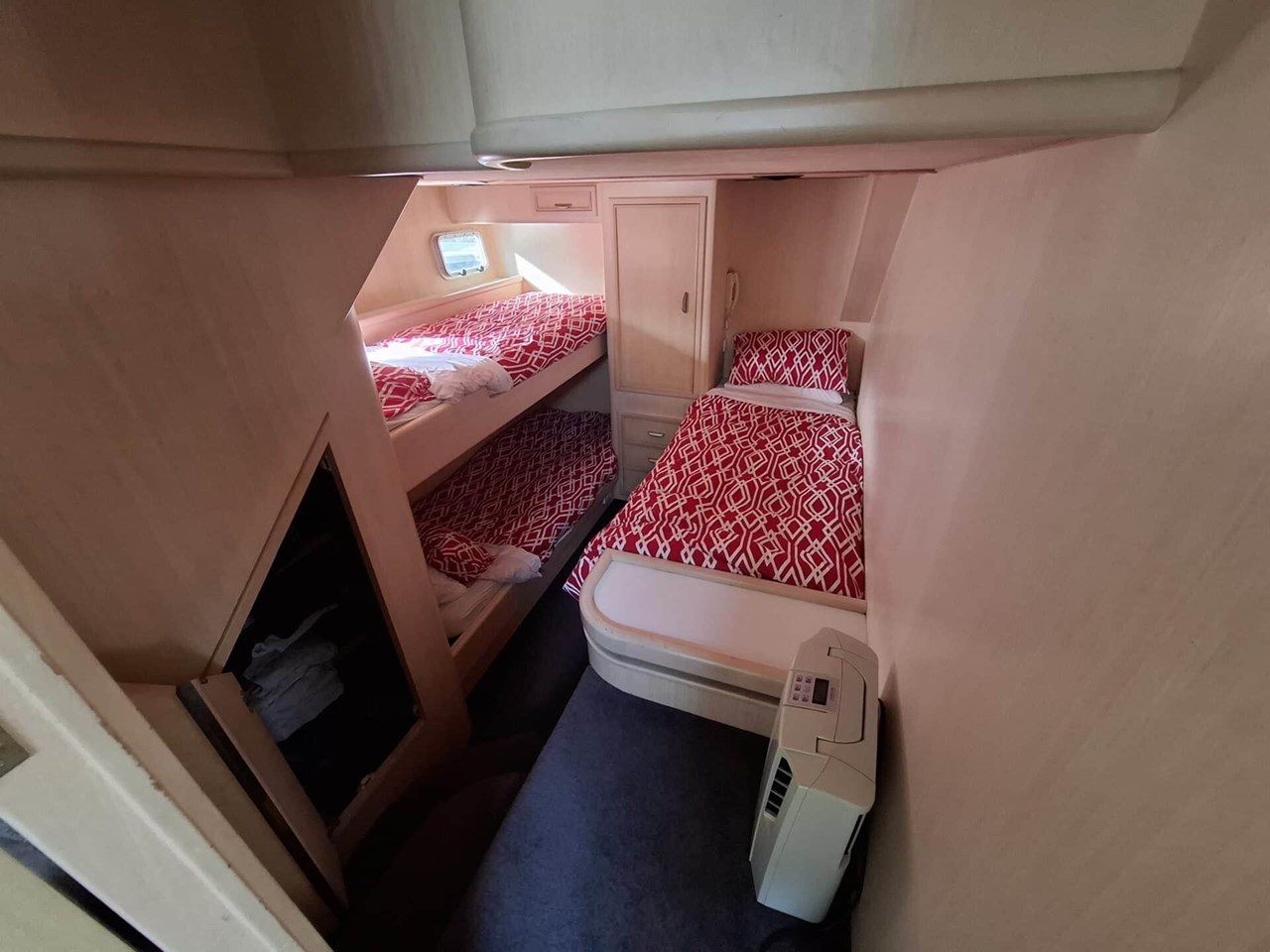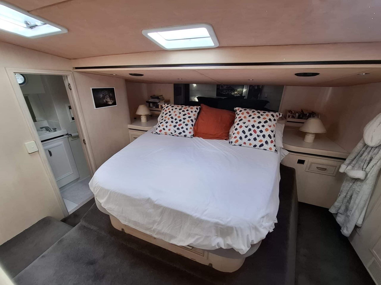 The accommodation consists of a large owners cabin with island bed and ensuite and shower. Also in this area are 2 more large cabins, one with large double island bed and the other with 3 single beds. Sleeping areas and relaxation areas are vast. All areas are very well set up with incredible amounts of user friendly space, 2 x V8 Fiat/Iveco Diesels (Derated from 700 to 620hp) Furuno NXT suite of Electronics, Huge volume, Multiple sleeping and entertaining areas.