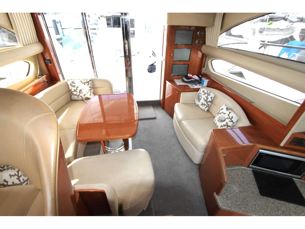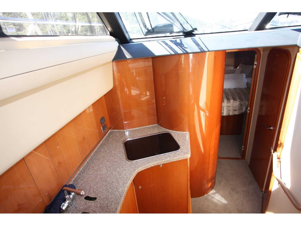 The galley is well-appointed with a microwave, three-burner gas hob, twin sinks and two electric fridges, making onboard cruising a pleasure.