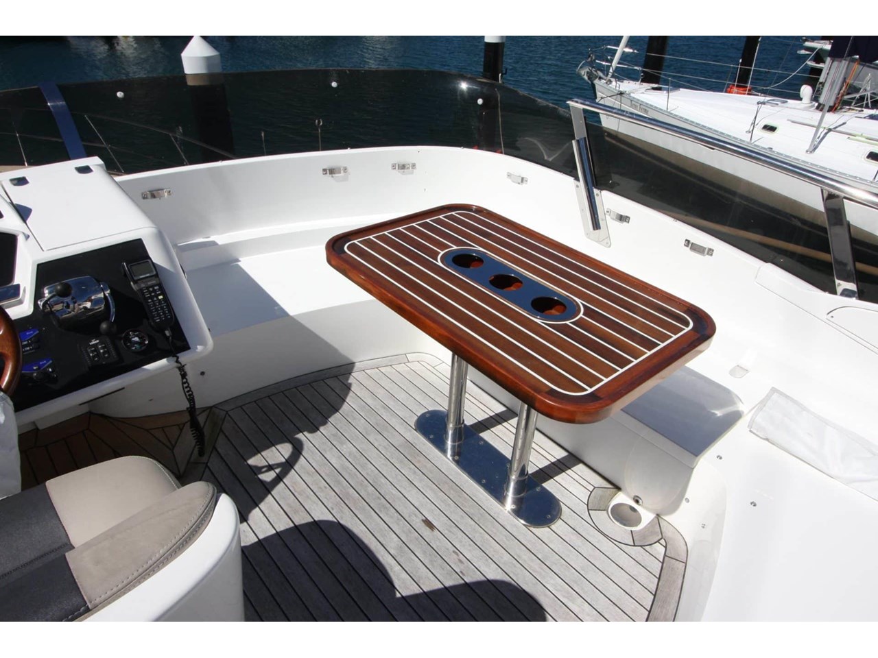 The flybridge is designed for relaxation and entertaining, featuring comfortable seating, a table, squabs, and protective covers, along with a secondary helm station. A Southern Pacific 2.6m RIB tender is included for easy shore access.