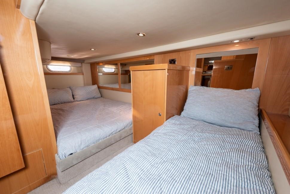 Air-conditioned saloon, plush finishes, sleeps five across two cabins and saloon.