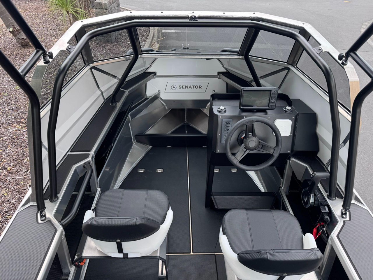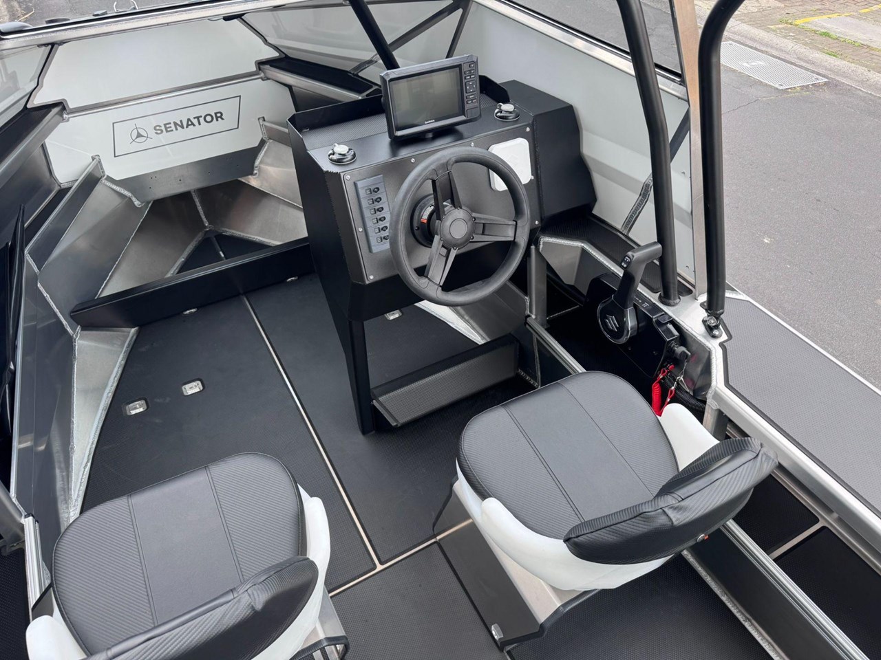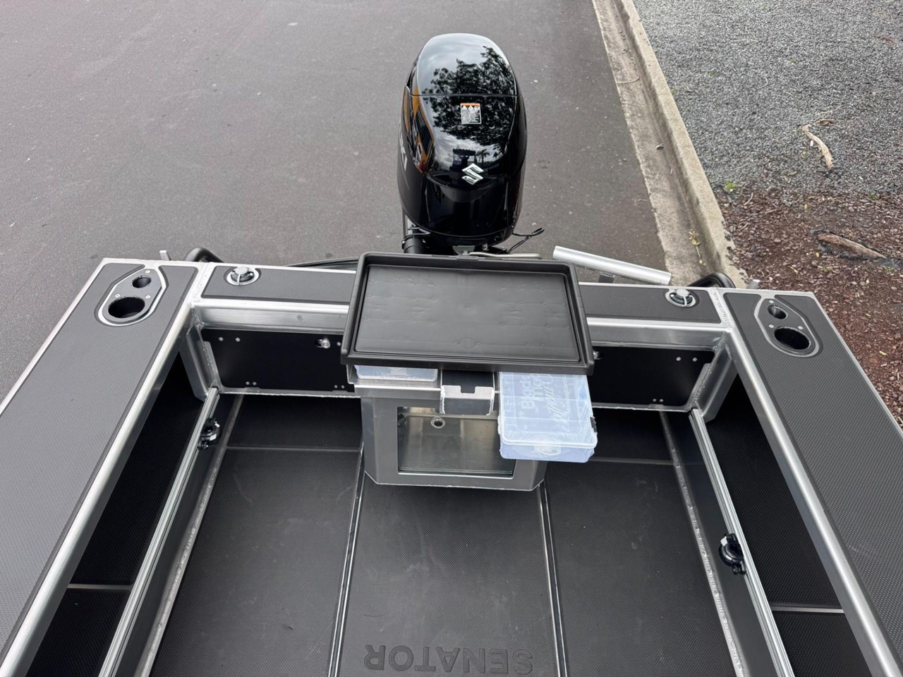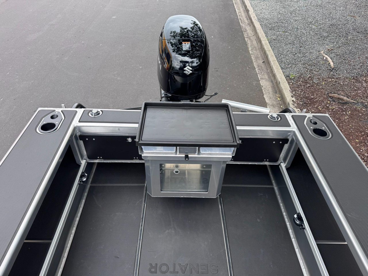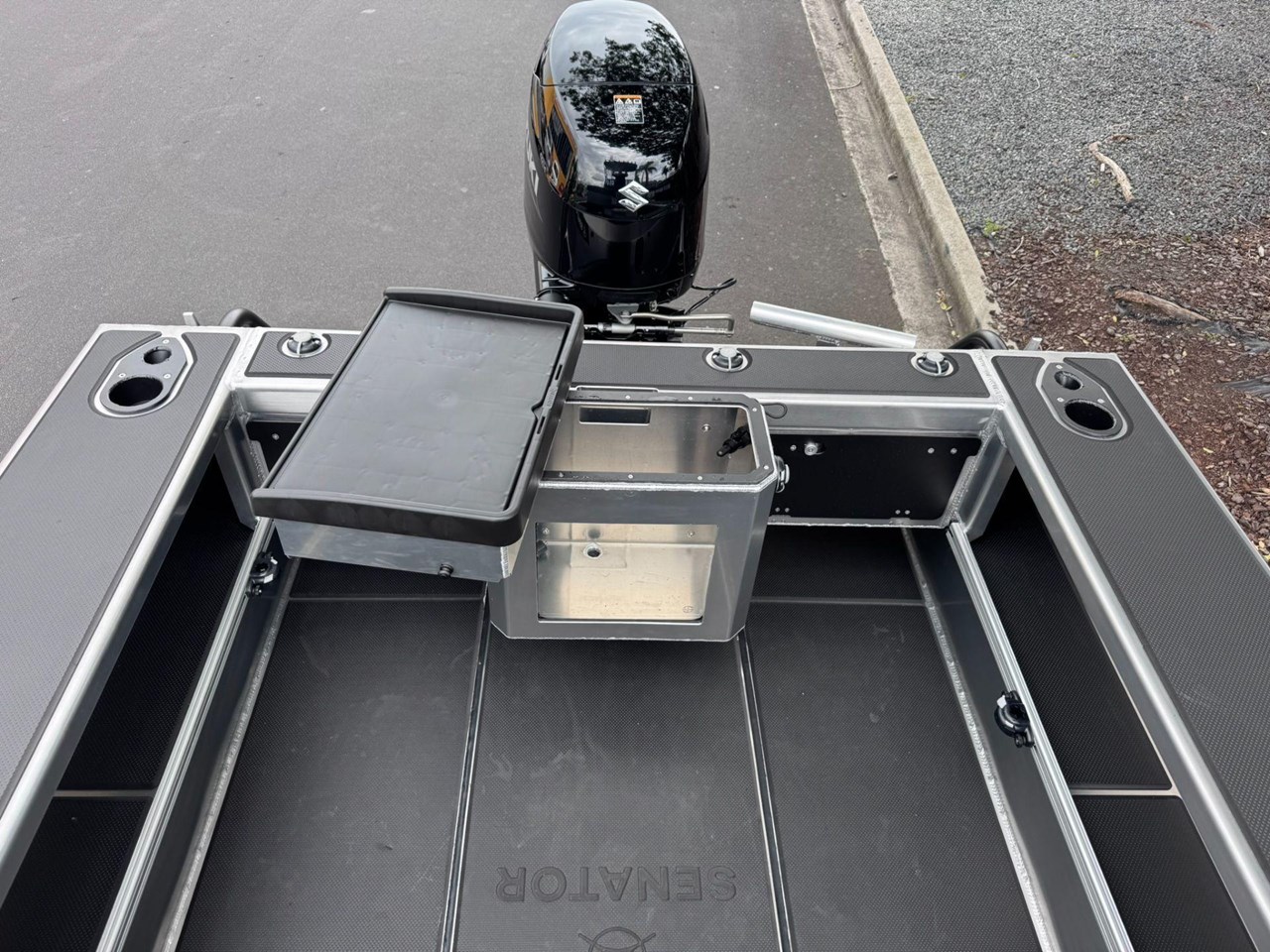 4x Rod Holder / Drink Holder Combos.... Adjustable Helm Seat with Chilly Storage underneath.... Anchor locker and Lid.... Battery Compartment with Opening Hatches.... Bilge Pump.... Boarding Ladder.... Boarding Platforms with Sealed Bouyancy.... Bow Rails - Powdercoated.... Fairlead and Bow Roller.... Floor Mounting Lugs for Modular System.... Foam Filled Pontoons.... Hi-Tech 1500 Deluxe Skippers Seat with Swivel.... Livebait and Washdown Pick Ups.... Passenger Grab Rail- Powdercoated.... Provision for Electric Trolling Motor Bracket & Battery Storage (mount not included).... Provision for Front Seating with Storage for Chemical Toilet (seating not included).... Railblaza Gunwale Pocket Rails.... Railblaza Starport fittings x4.... Rotary Steering & Wheel.... Senator Decals and Hull Stripe.... Side Console with Grab Rail & Screen.... Transducer Mounting Plate.... Transom Grab Rails - Powdercoated.... U-Deck applied to Floor (Nano Dot).... U-Deck applied to gunnels, transom & platforms (Nano Dot).... Wave Breaker Transom.... Wide Gunnel Combings.... Wiring Loom and 6 Way Switch Panel.