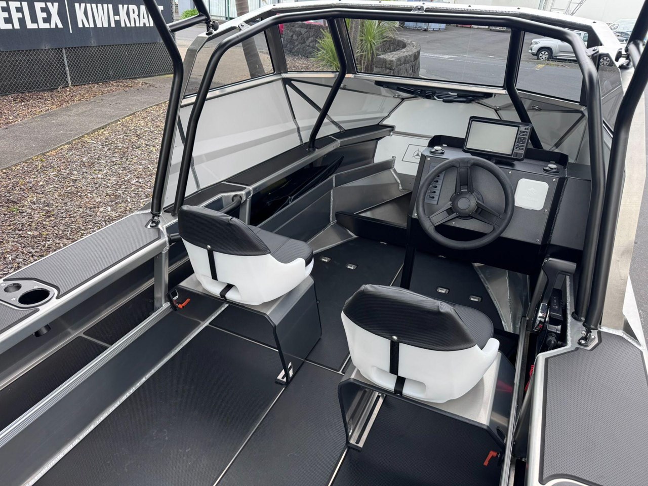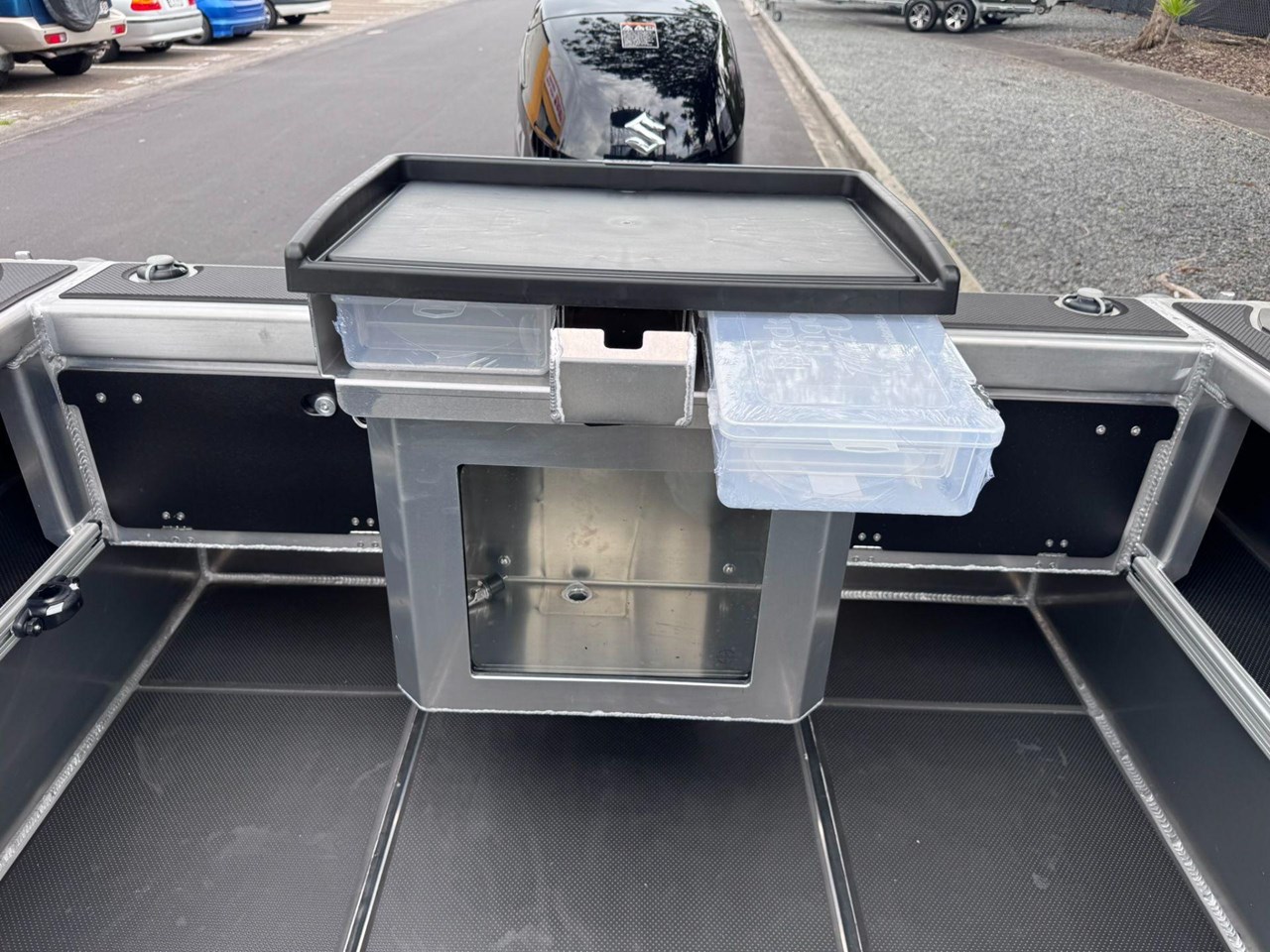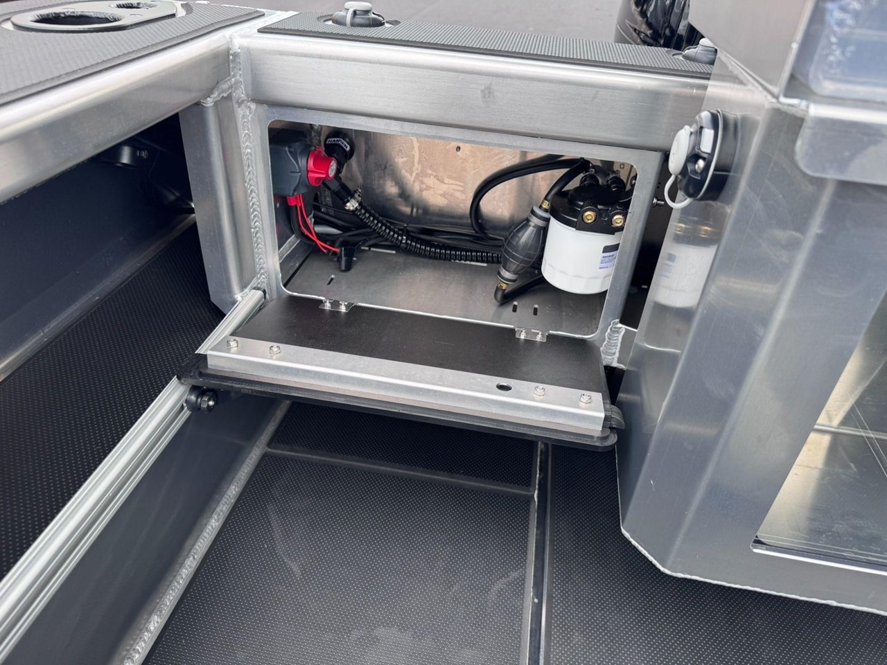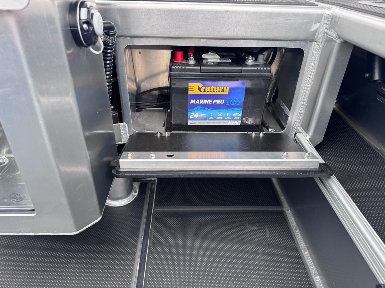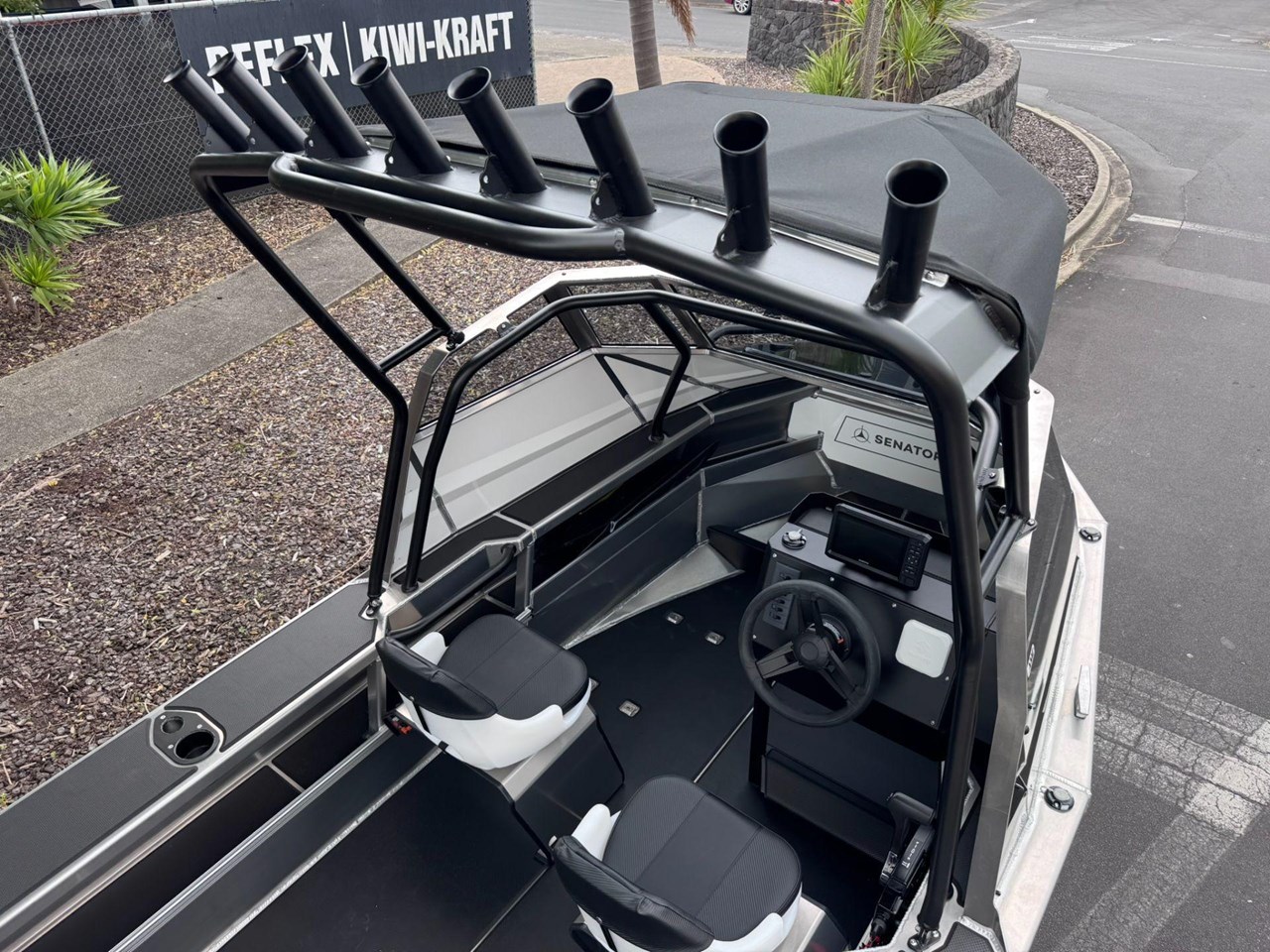 4x Rod Holder / Drink Holder Combos.... Adjustable Helm Seat with Chilly Storage underneath.... Anchor locker and Lid.... Battery Compartment with Opening Hatches.... Bilge Pump.... Boarding Ladder.... Boarding Platforms with Sealed Bouyancy.... Bow Rails - Powdercoated.... Fairlead and Bow Roller.... Floor Mounting Lugs for Modular System.... Foam Filled Pontoons.... Hi-Tech 1500 Deluxe Skippers Seat with Swivel.... Livebait and Washdown Pick Ups.... Passenger Grab Rail- Powdercoated.... Provision for Electric Trolling Motor Bracket & Battery Storage (mount not included).... Provision for Front Seating with Storage for Chemical Toilet (seating not included).... Railblaza Gunwale Pocket Rails.... Railblaza Starport fittings x4.... Rotary Steering & Wheel.... Senator Decals and Hull Stripe.... Side Console with Grab Rail & Screen.... Transducer Mounting Plate.... Transom Grab Rails - Powdercoated.... U-Deck applied to Floor (Nano Dot).... U-Deck applied to gunnels, transom & platforms (Nano Dot).... Wave Breaker Transom.... Wide Gunnel Combings.... Wiring Loom and 6 Way Switch Panel.