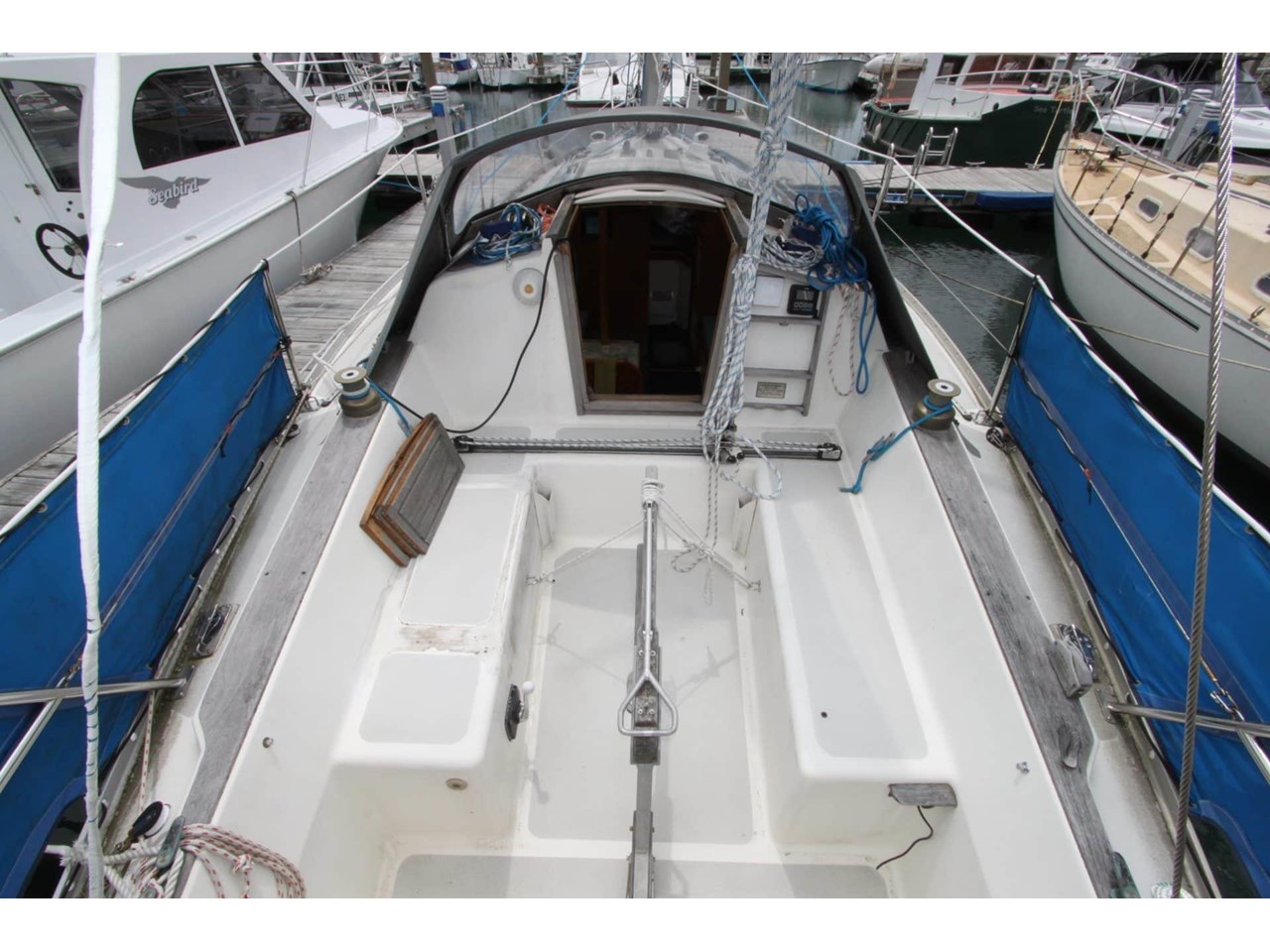 Deck & Cockpit: Lines led aft to cockpit with Spinlocks, teak cockpit trim, aft boarding platform with ladder.