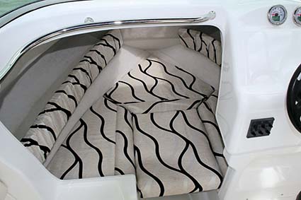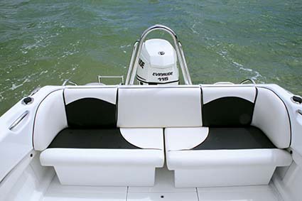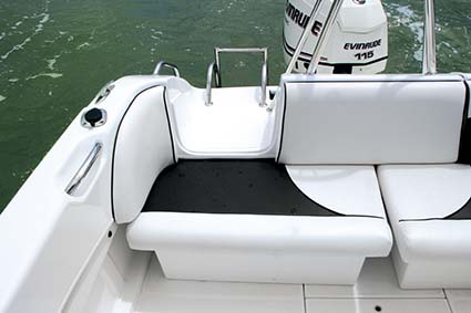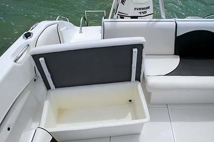 Upholstered pads along the transom and rear part of the gunwale combine with the squabs on the bins to provide a triple bench seat along the rear of the boat. These removable bins have been a standard feature of Sea Nymph for many years.