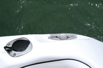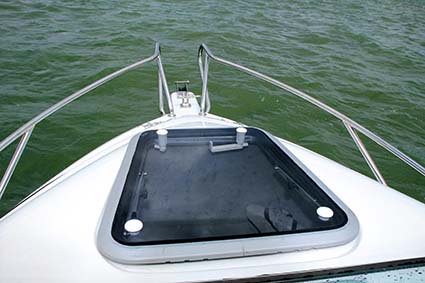 The test boat did not have an anchor winch fitted but the large anchor locker with hatch could easily hold a drum winch. The split bowrail makes it easy to get the anchor over the bow and a removable pin in the bollard enables the rode to be secured.