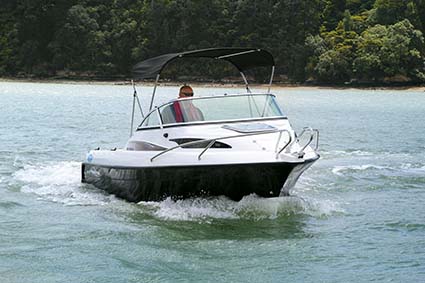 We took the boat out on the Auckland harbour in some typical blustery weather. In the slop we pushed the boat hard and the hull quickly got up onto its planing strakes. Conditions did not let us go anywhere near top speed but the deep-vee hull cut easily through the rough stuff. The lined hull was reasonably quiet, as would be expected from a fibreglass boat, and comfortable despite being bounced around by the waves.