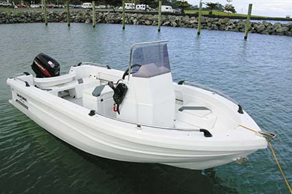Hanging off the back was an electric-start Tohatsu 40hp two-stroke outboard motor, a modest yet reliable little unit that well suits the ethos of no-nonsense economy and practicality. This motor is right in the middle of the recommended range of 30 to 50hp, but felt just right with two occupants. A small boarding step moulded into the hull either side of the motor has a non-slip moulded surface, with a stainless steel boarding ladder on the port side. Rod-holders are fitted into each corner of the gunwale.