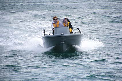 The foam-filled plastic hull absorbs most of the water noise and the boat feels smooth, safe and remarkably quiet. Throwing it around sharply was comfortable, although you need to hang on tight in a sharp turn as the gullwing does not lean steeply into the turn like a conventional vee-hull.